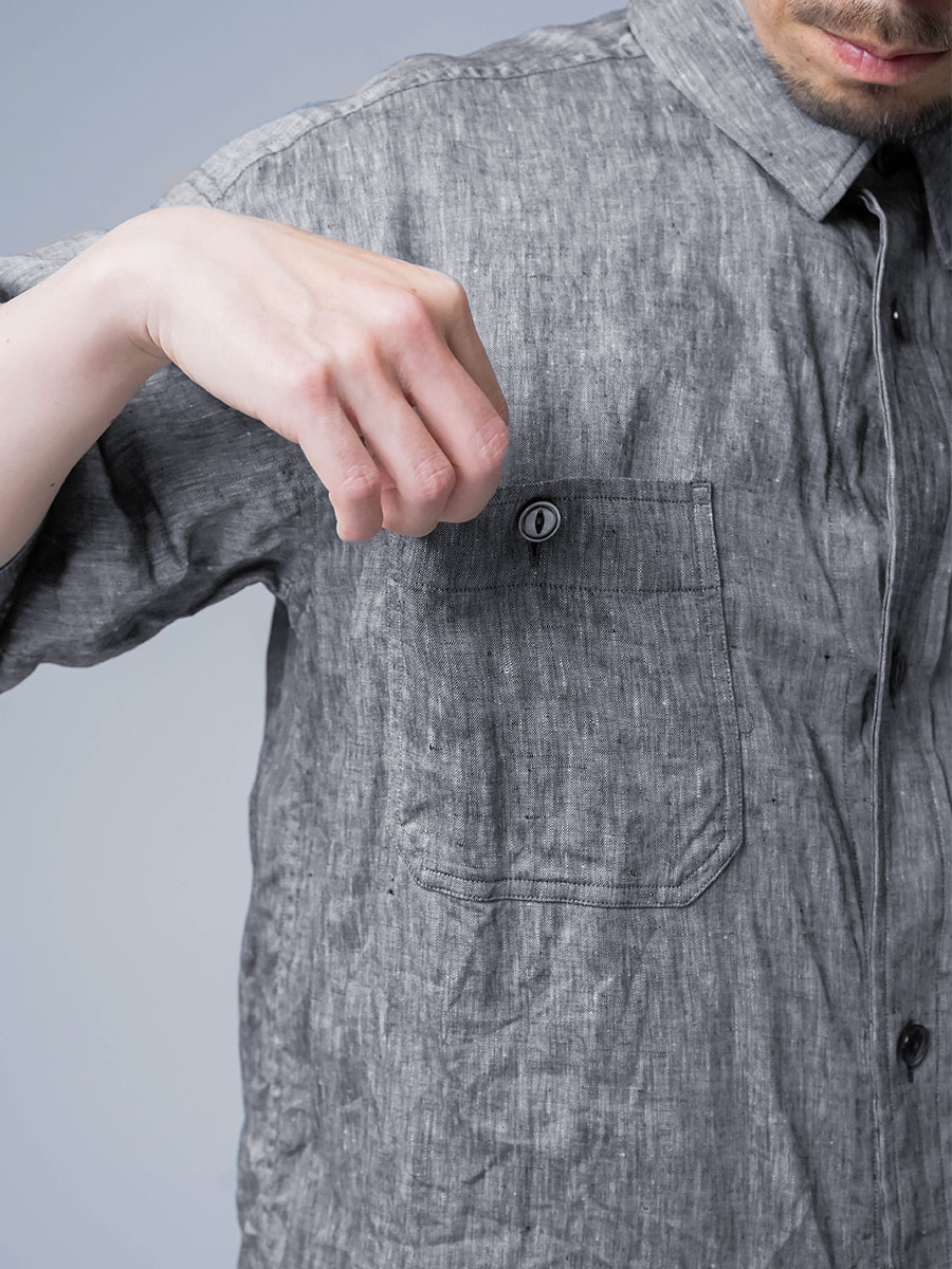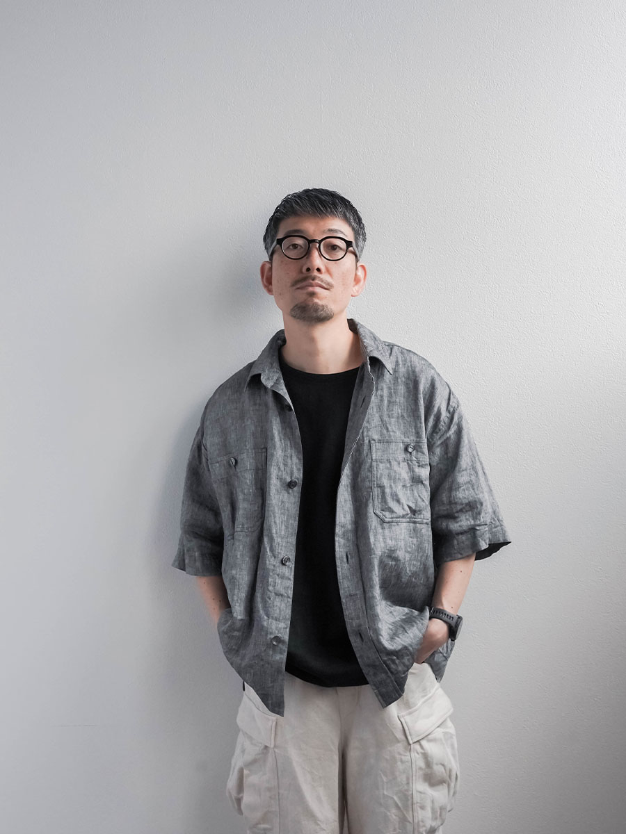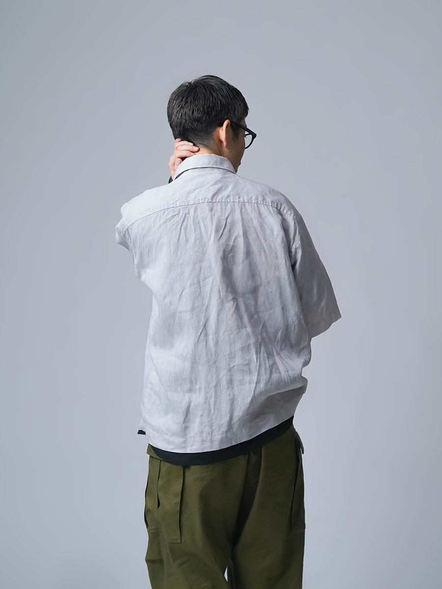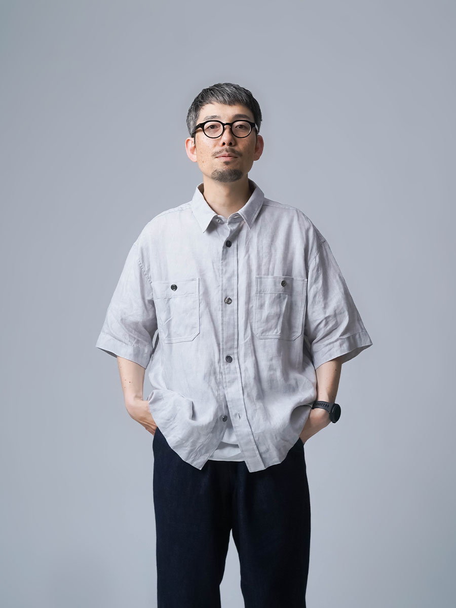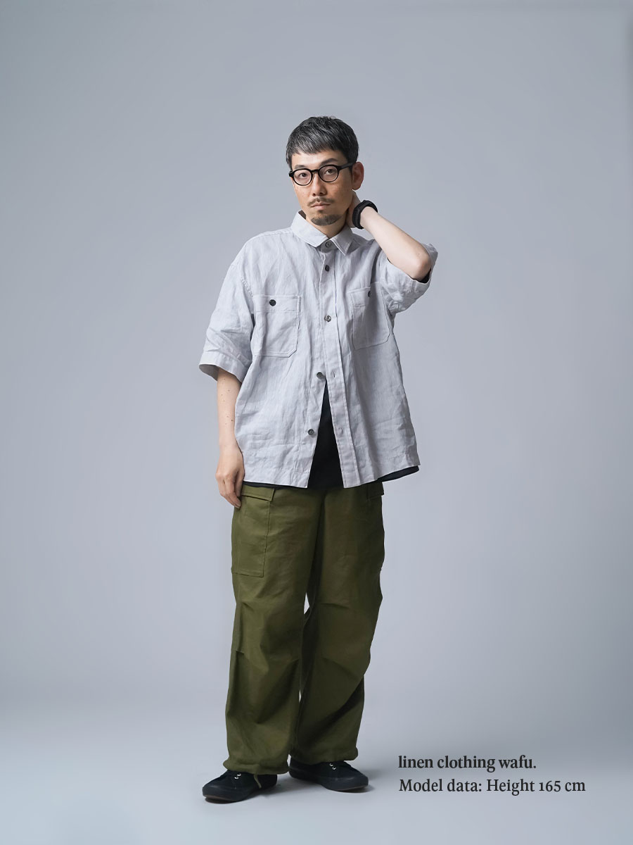 実にメンズらしい、ワークテイストなシャツです。着丈はお尻が半分隠れるくらい。身幅はかなりたっぷりとしています。袖丈は肘の関節プラス3センチほど。ゆったりなボックスシルエットです。胸のポケットがワーク感を演出し、武骨な雰囲気に仕上がっています。ボタンを開けても、閉めてもいい雰囲気で着られる万能型。武骨な作品ながら女性の方がスカートとコーデするのもいいかなと思います。この夏一押しの半袖シャツです。