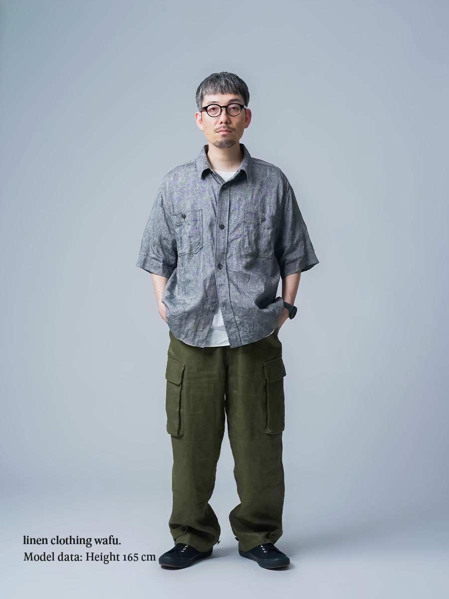 - ※生地工場の生産時期によって色味の濃淡が出ることがございます。セットアップでの着用の場合はご相談下さい。カラーリネンは最初色落ちや生地の性質上、毛羽落ちがある場合がございます。落ち着くまで数回は単品でのお洗濯を。最初は水通しをおすすめします。表面の毛羽立ちがとれて、肌への刺激が極端に少なくなります。リネン特有のネップ、節がございます。