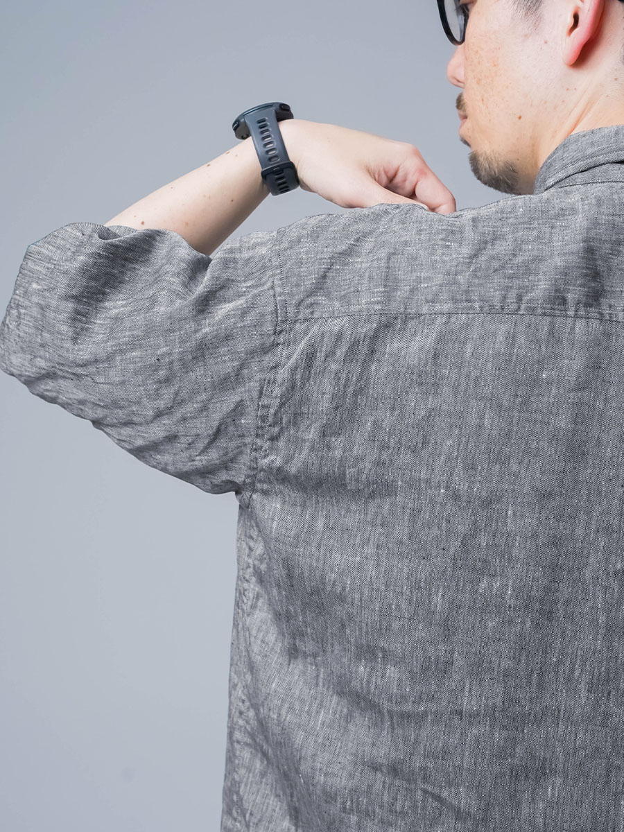 着丈はお尻がしっかり隠れる長さで、安心感のある丈感。袖丈は肘が隠れるくらいで、程よく軽やかな印象です。アームホールはきつすぎず、肩がやや落ちたリラックス感のあるシルエット。ボタンを閉めてもゆとりがあり、窮屈感なく着用できます。襟付きでも重たく見えず、さらっと着られる軽やかさが魅力。暑い時期でもきちんと感をキープできる一枚です。
