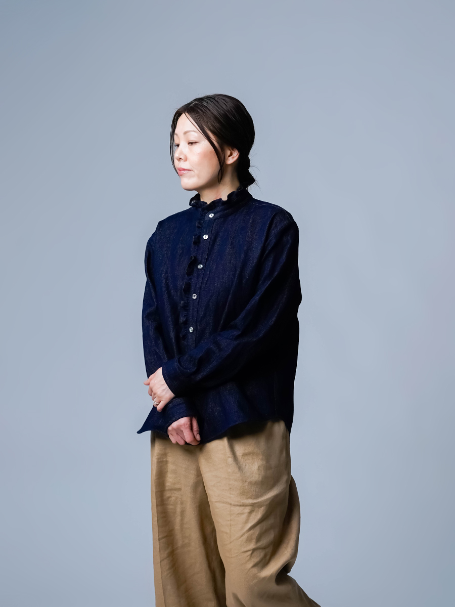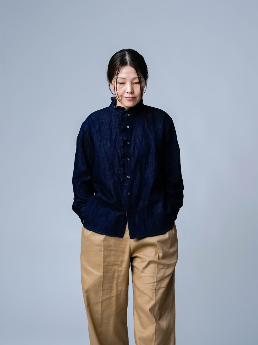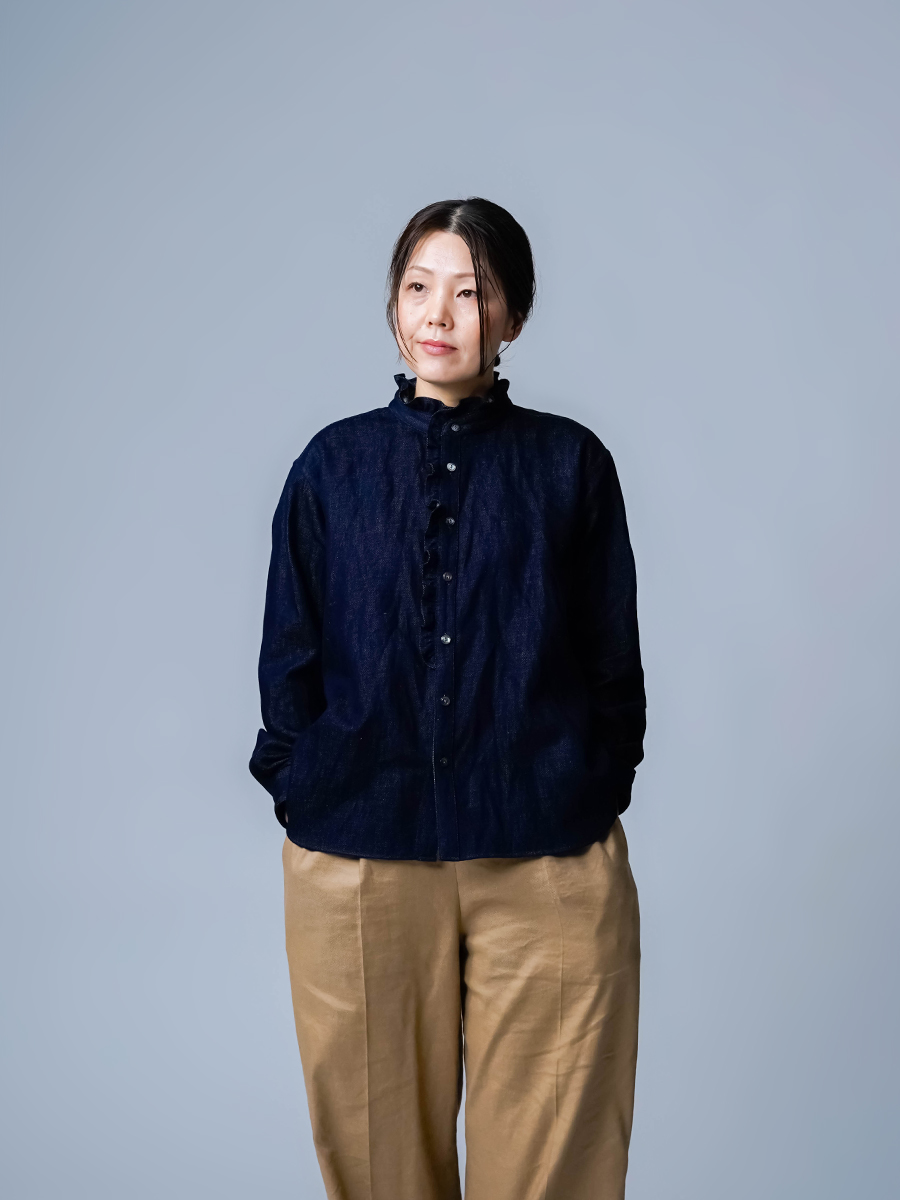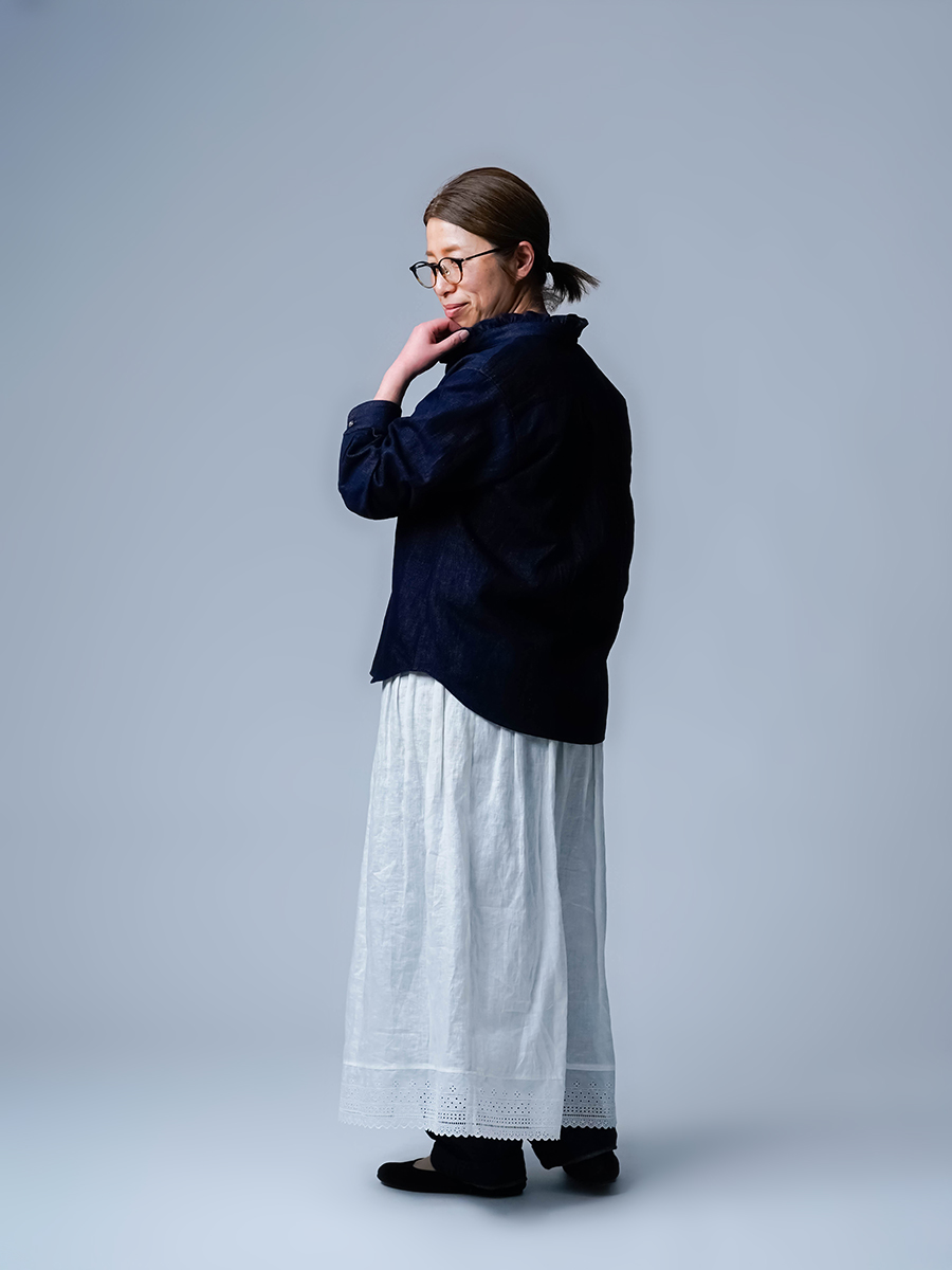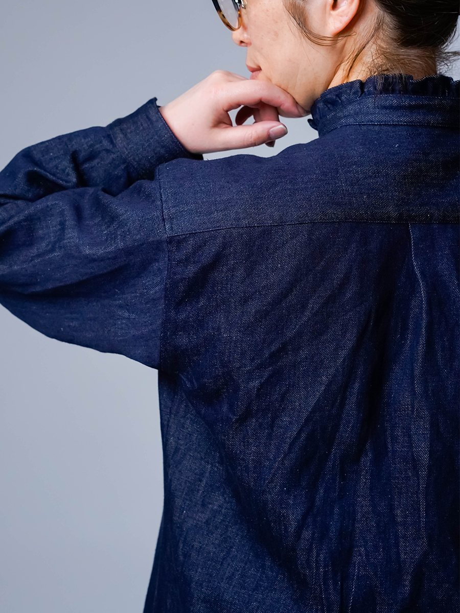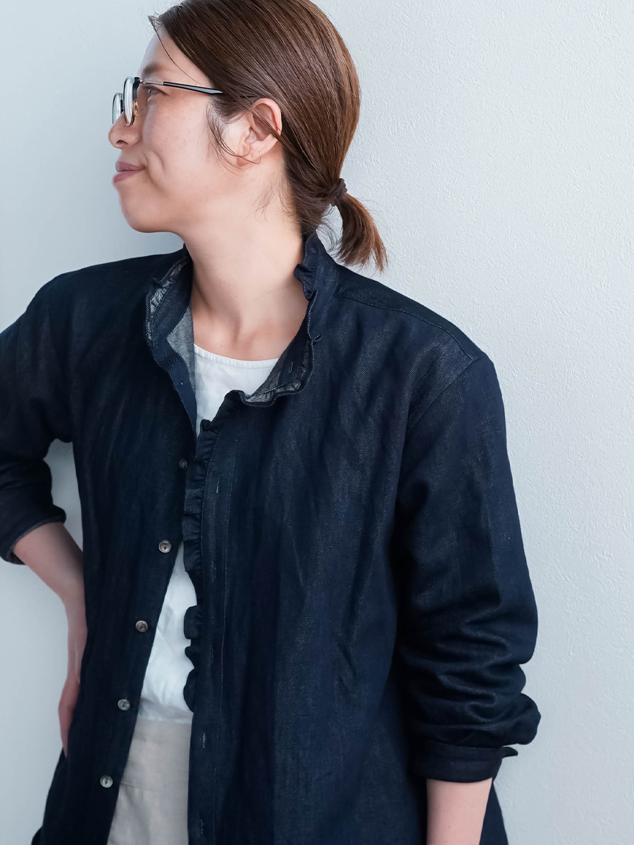 フリルとデニムの組み合わせが、こんなにも素敵な作品になるなんて思いませんでした。年齢を重ねるにつれて、甘さのあるデザインにはつい一歩引いてしまいがちですが、この作品は違います。甘さとデニムのかっこよさが、なんともいい塩梅で共存していて、着ると気持ちがすっと整います。フリルは削ぎ落してきた自分ですが、これは挑戦してみたいです。そんな不思議な魅力のあるシャツです。Mサイズの着丈は骨盤あたり、袖丈は手首です。全体的にぴったりなサイズ感で脇まわりは肌に近いので、インナーはタンクトップくらいがよさそうです。Lサイズの着丈はお尻が半分隠れるくらいで、袖丈は手の甲が半分隠れる長さです。全体にはほどよいゆとりがあり、長袖インナーも重ねられる余裕があります。