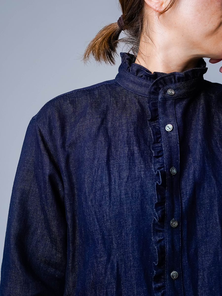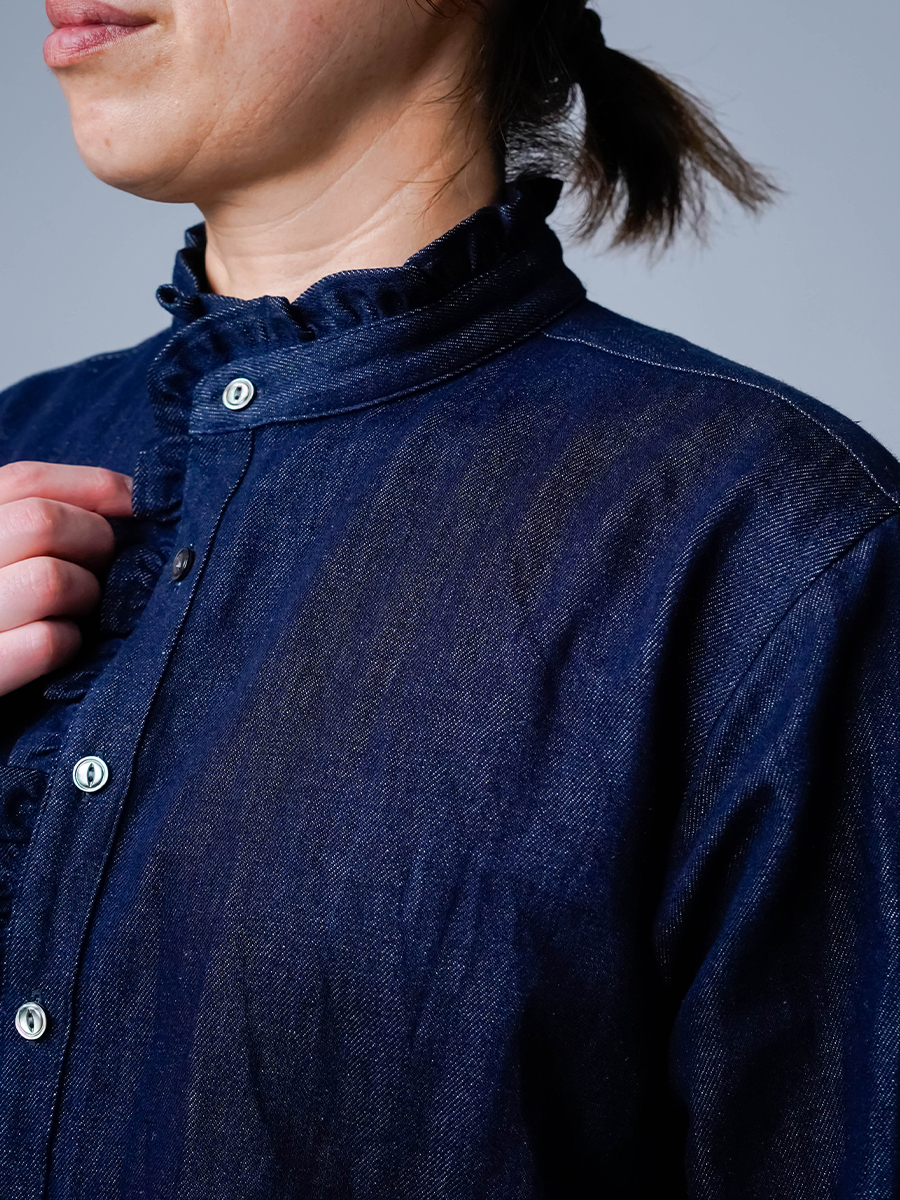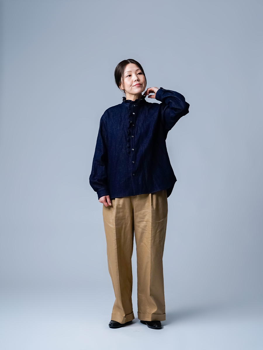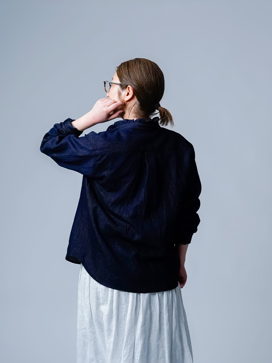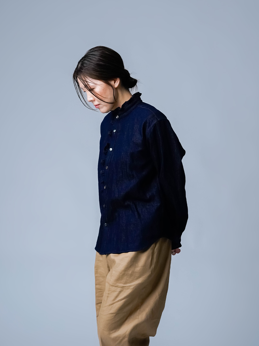 フリルとデニムの組み合わせが、こんなにも素敵な作品になるなんて思いませんでした。年齢を重ねるにつれて、甘さのあるデザインにはつい一歩引いてしまいがちですが、この作品は違います。甘さとデニムのかっこよさが、なんともいい塩梅で共存していて、着ると気持ちがすっと整います。フリルは削ぎ落してきた自分ですが、これは挑戦してみたいです。そんな不思議な魅力のあるシャツです。Mサイズの着丈は骨盤あたり、袖丈は手首です。全体的にぴったりなサイズ感で脇まわりは肌に近いので、インナーはタンクトップくらいがよさそうです。Lサイズの着丈はお尻が半分隠れるくらいで、袖丈は手の甲が半分隠れる長さです。全体にはほどよいゆとりがあり、長袖インナーも重ねられる余裕があります。