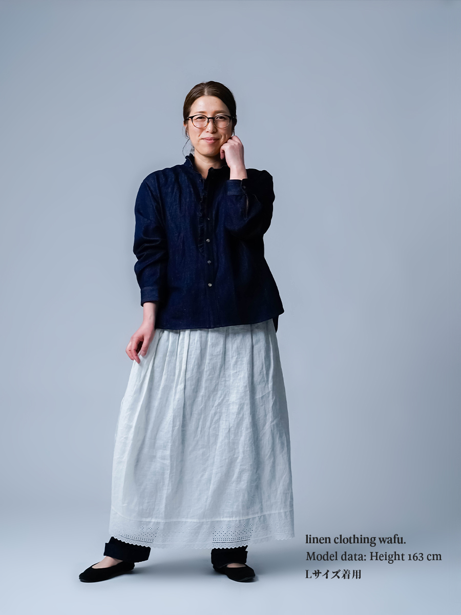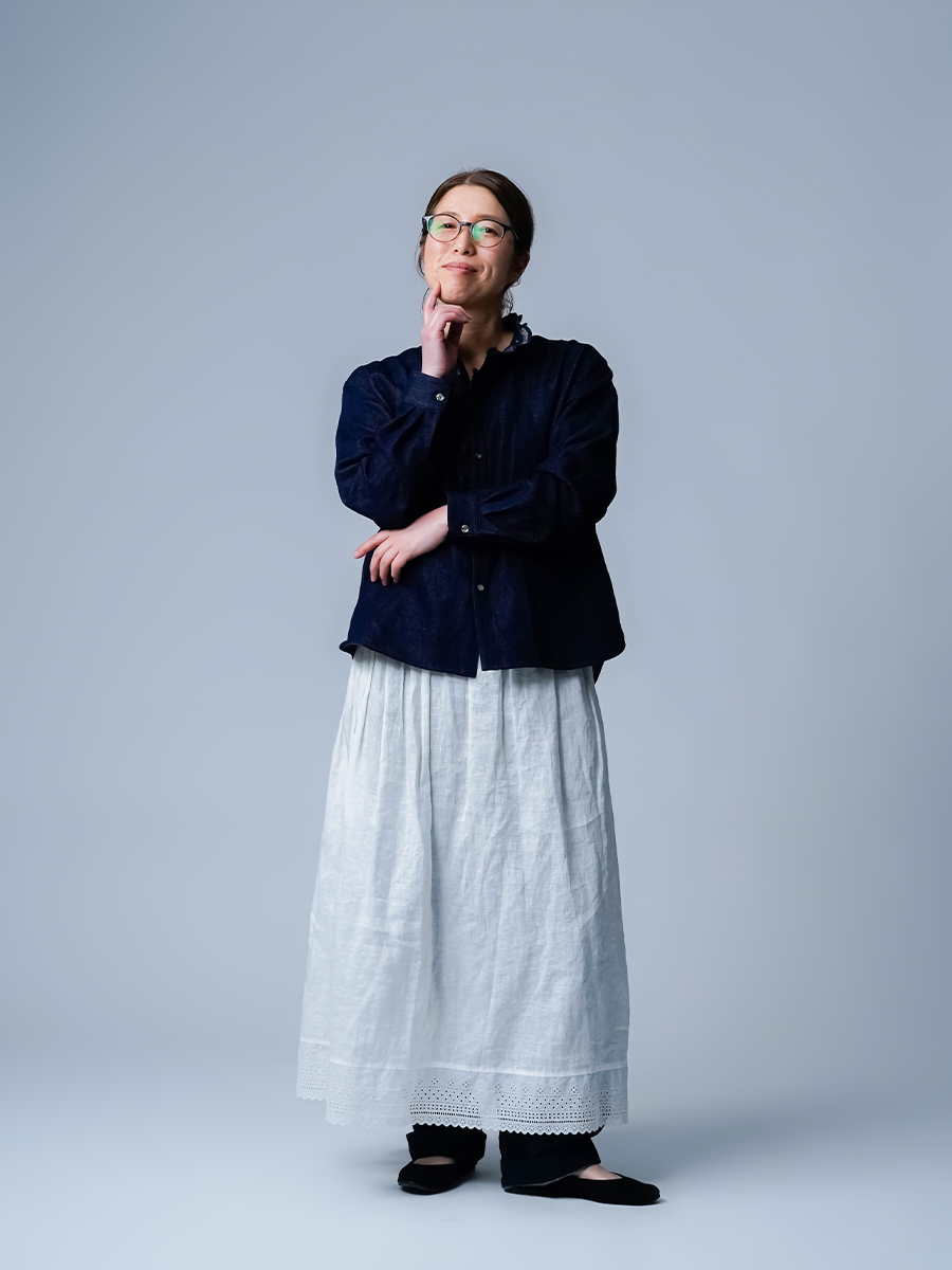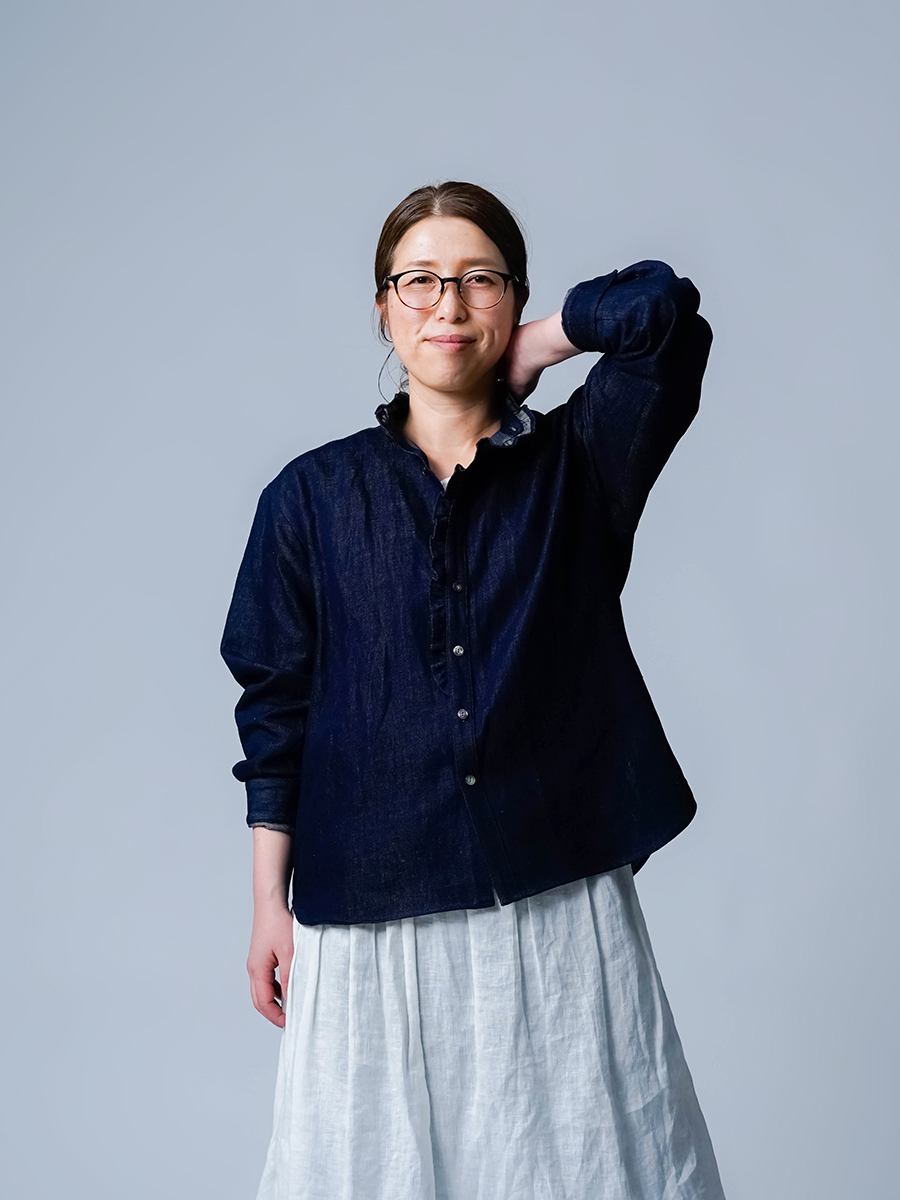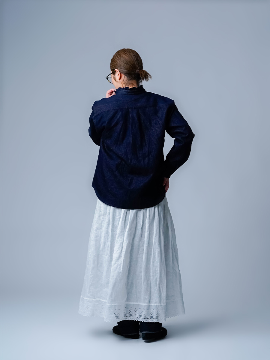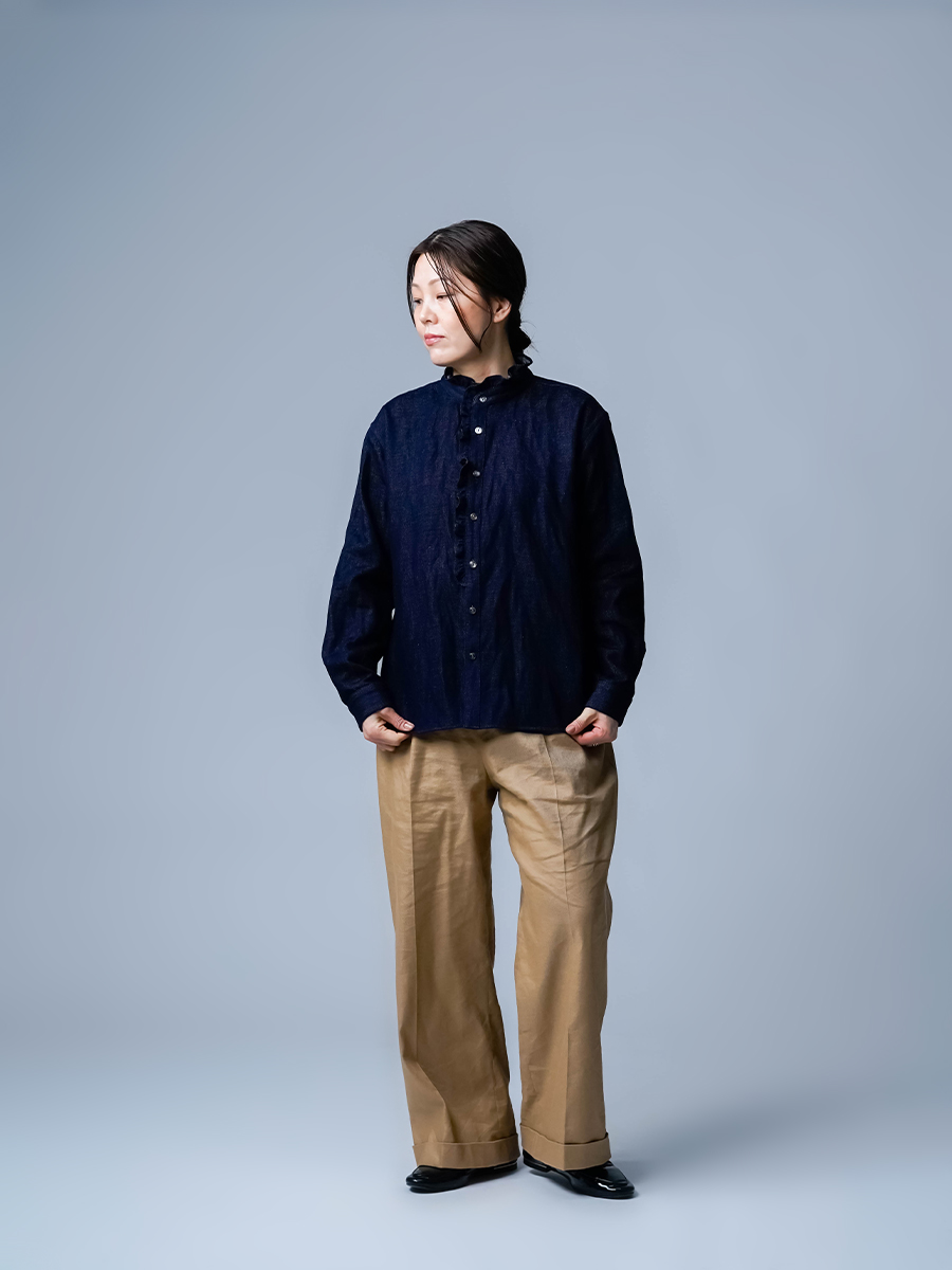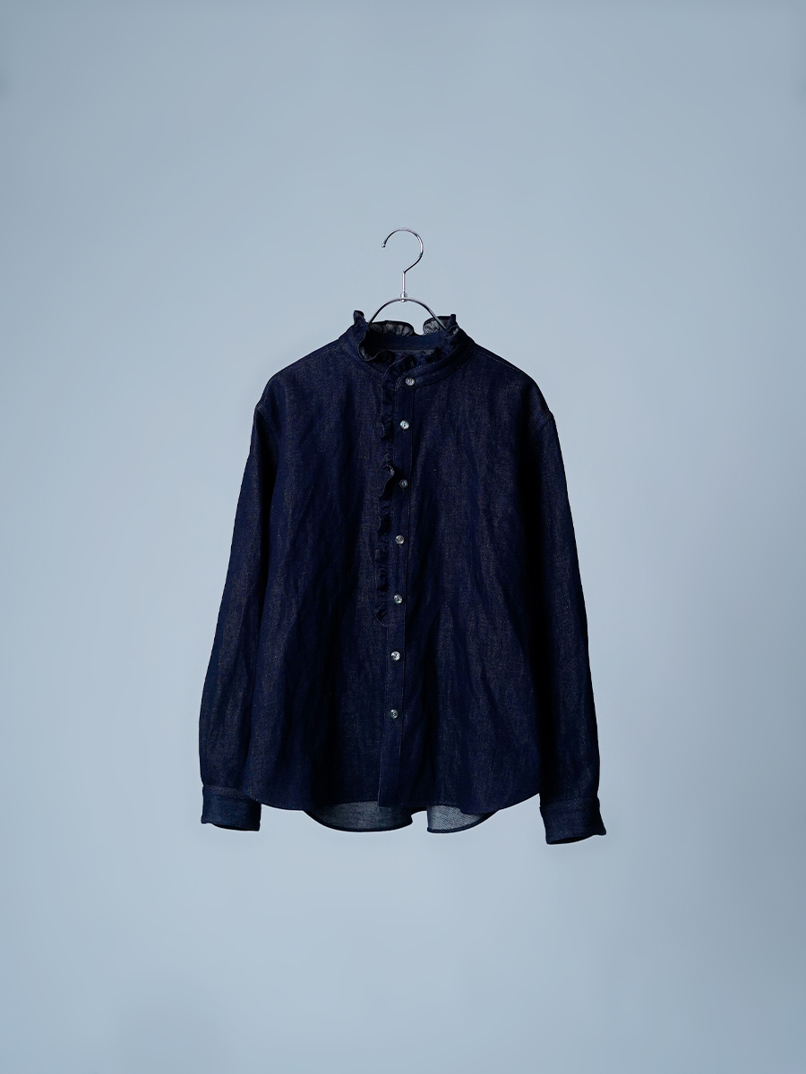フリルとデニムの組み合わせが、こんなにも素敵な作品になるなんて思いませんでした。年齢を重ねるにつれて、甘さのあるデザインにはつい一歩引いてしまいがちですが、この作品は違います。甘さとデニムのかっこよさが、なんともいい塩梅で共存していて、着ると気持ちがすっと整います。フリルは削ぎ落してきた自分ですが、これは挑戦してみたいです。そんな不思議な魅力のあるシャツです。Mサイズの着丈は骨盤あたり、袖丈は手首です。全体的にぴったりなサイズ感で脇まわりは肌に近いので、インナーはタンクトップくらいがよさそうです。Lサイズの着丈はお尻が半分隠れるくらいで、袖丈は手の甲が半分隠れる長さです。全体にはほどよいゆとりがあり、長袖インナーも重ねられる余裕があります。