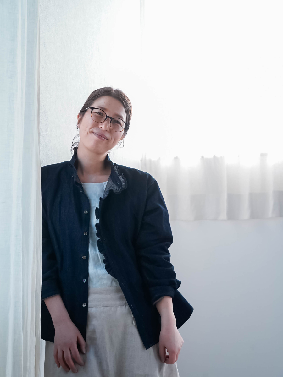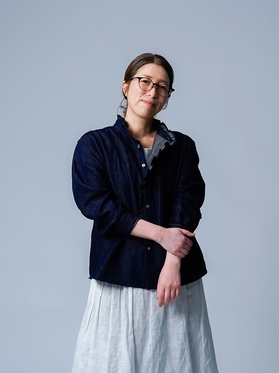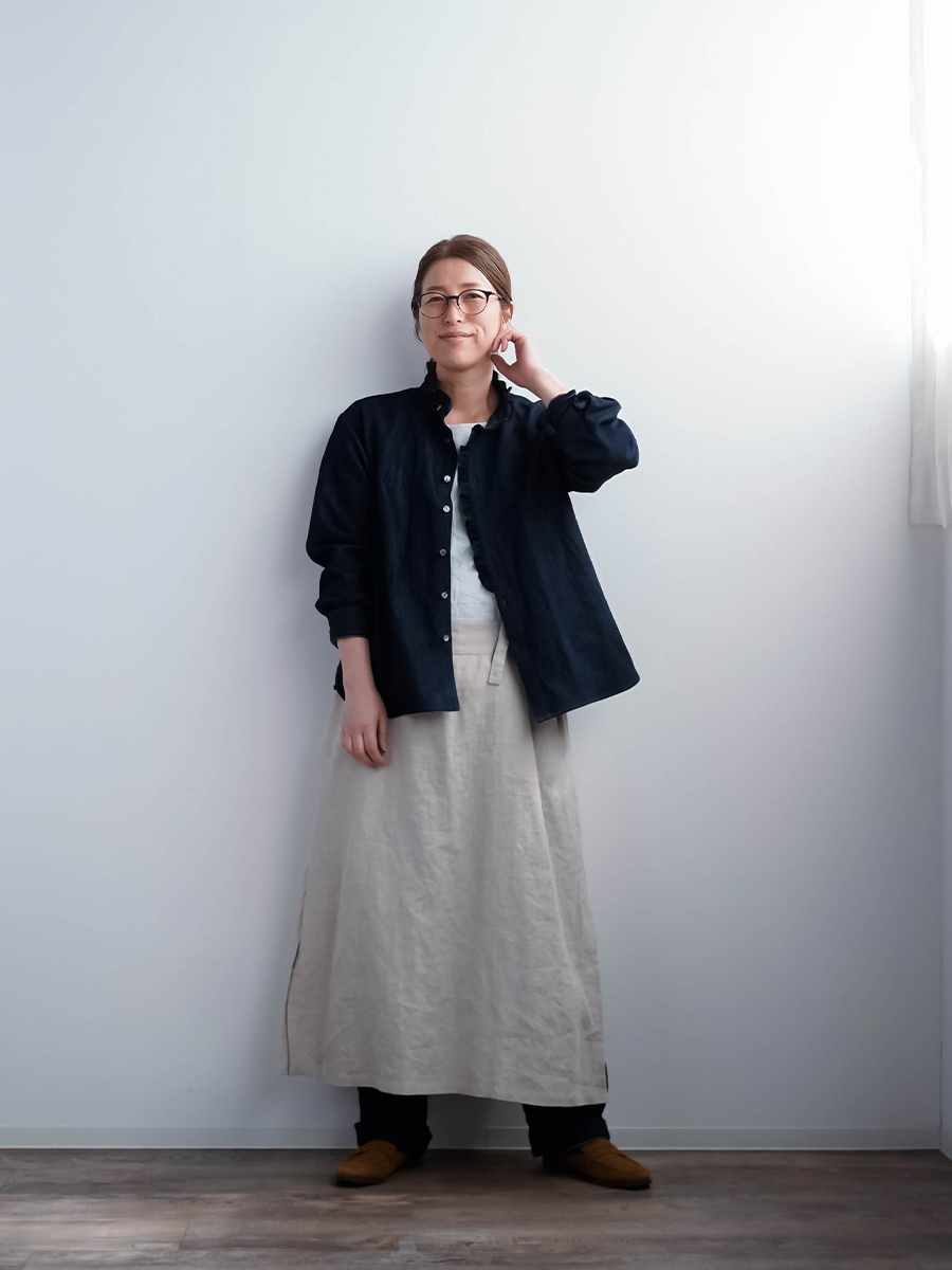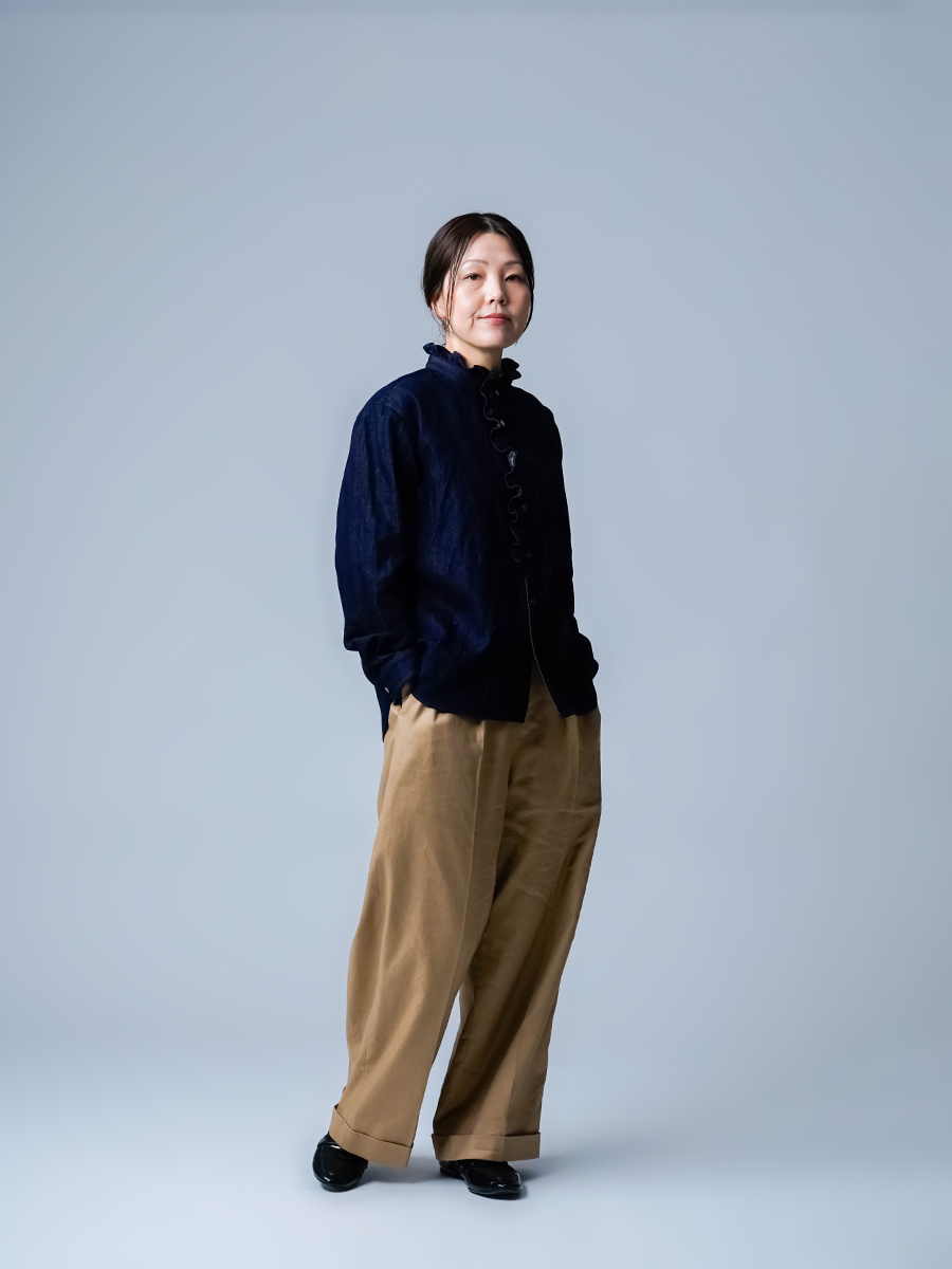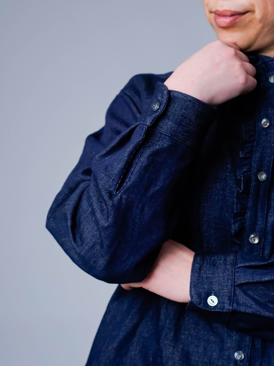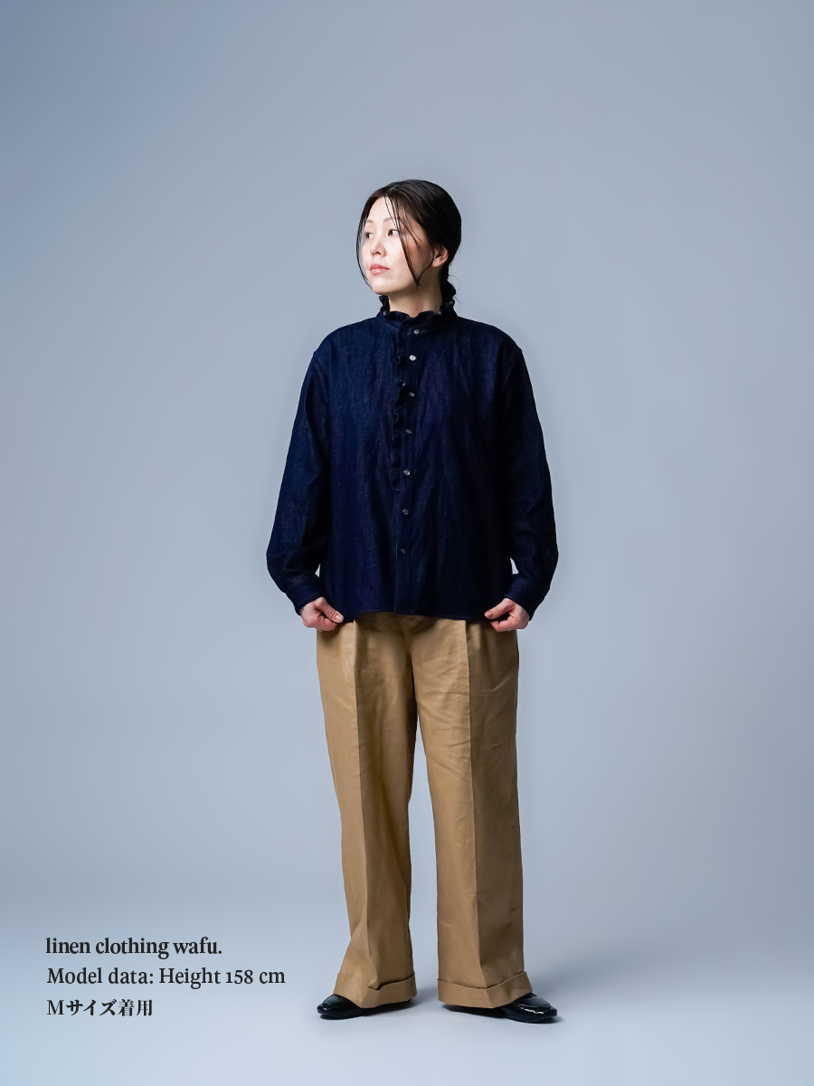 フリルとデニムの組み合わせが、こんなにも素敵な作品になるなんて思いませんでした。年齢を重ねるにつれて、甘さのあるデザインにはつい一歩引いてしまいがちですが、この作品は違います。甘さとデニムのかっこよさが、なんともいい塩梅で共存していて、着ると気持ちがすっと整います。フリルは削ぎ落してきた自分ですが、これは挑戦してみたいです。そんな不思議な魅力のあるシャツです。Mサイズの着丈は骨盤あたり、袖丈は手首です。全体的にぴったりなサイズ感で脇まわりは肌に近いので、インナーはタンクトップくらいがよさそうです。Lサイズの着丈はお尻が半分隠れるくらいで、袖丈は手の甲が半分隠れる長さです。全体にはほどよいゆとりがあり、長袖インナーも重ねられる余裕があります。