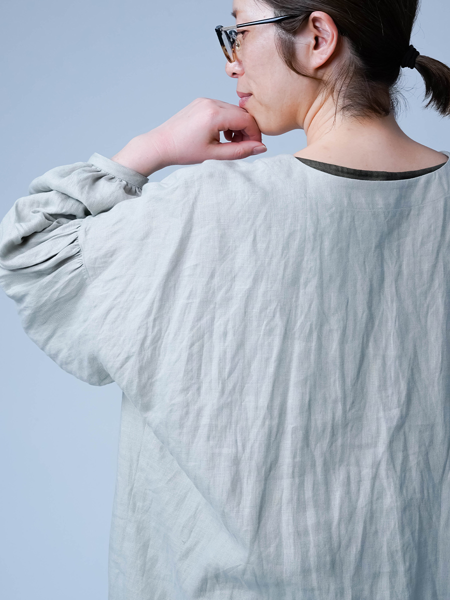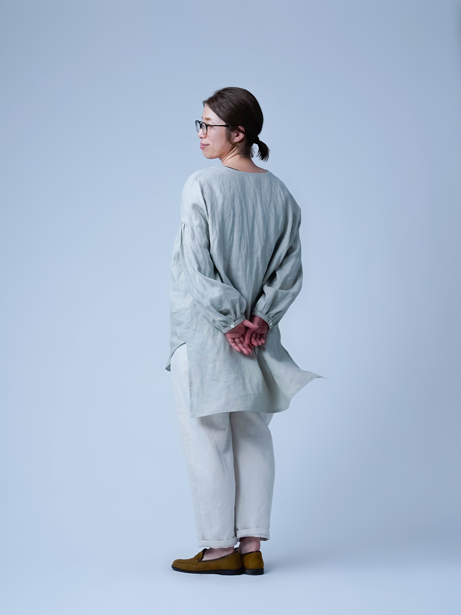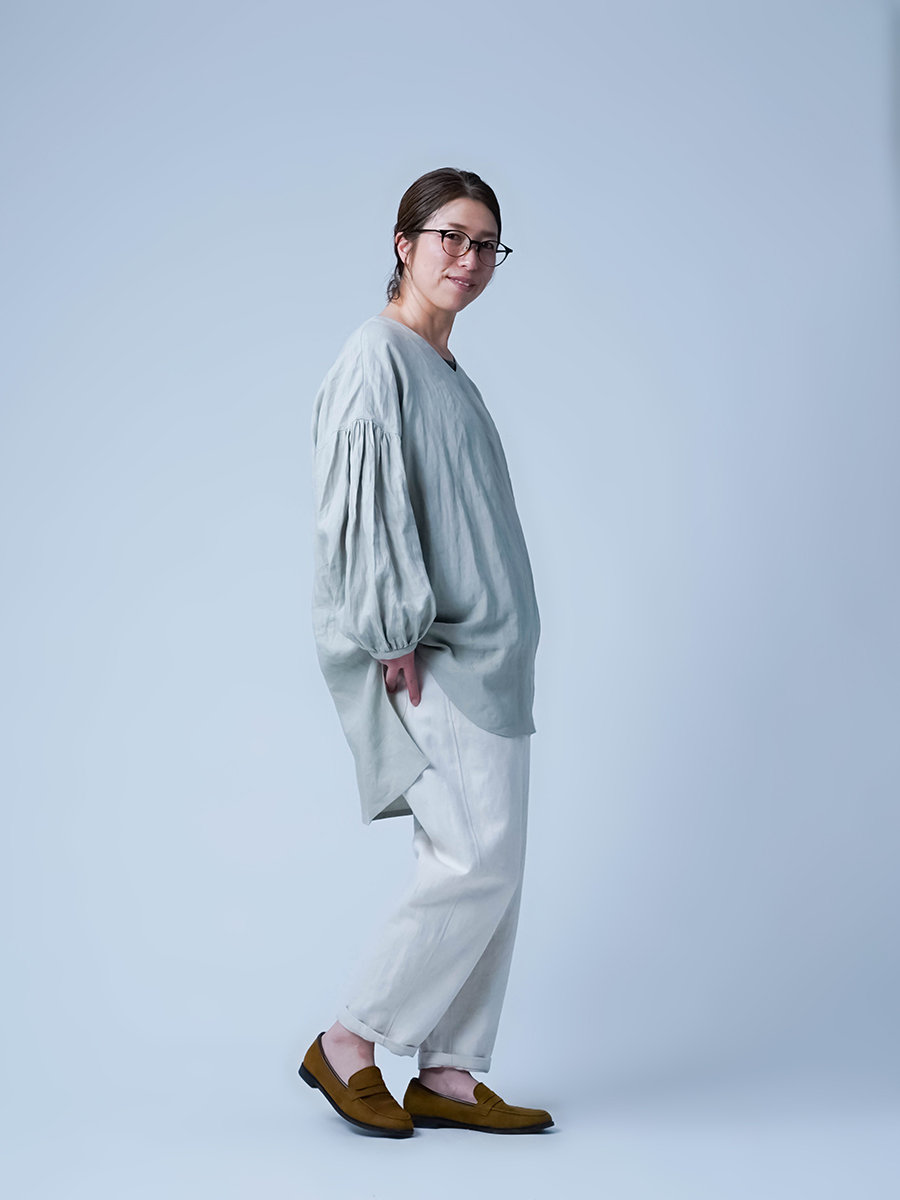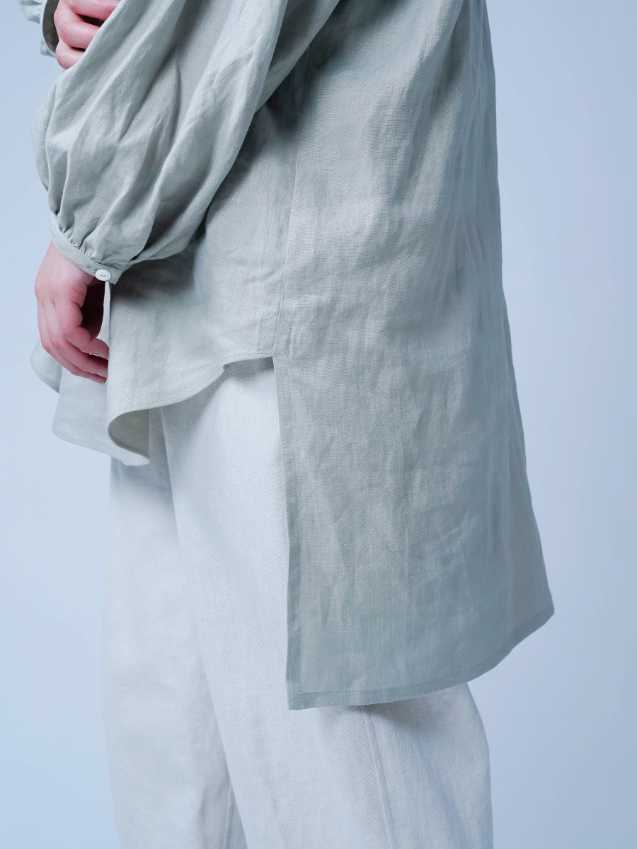 - ※生地工場の生産時期によって色味の濃淡が出ることがございます。セットアップでの着用の場合はご相談下さい。カラーリネンは最初色落ちや生地の性質上、毛羽落ちがある場合がございます。落ち着くまで数回は単品でのお洗濯を。最初は水通しをおすすめします。表面の毛羽立ちがとれて、肌への刺激が極端に少なくなります。リネン特有のネップ、節がございます。