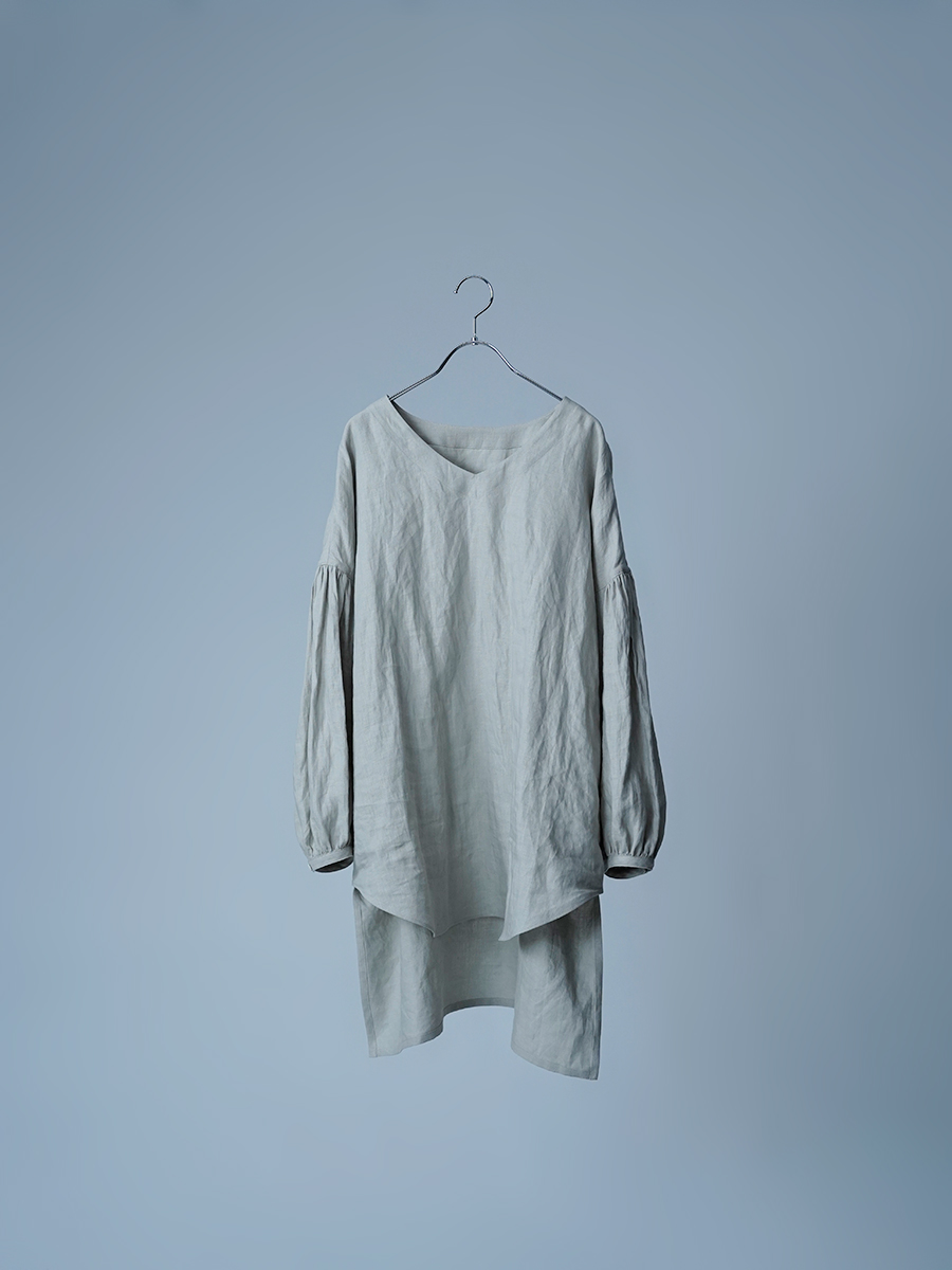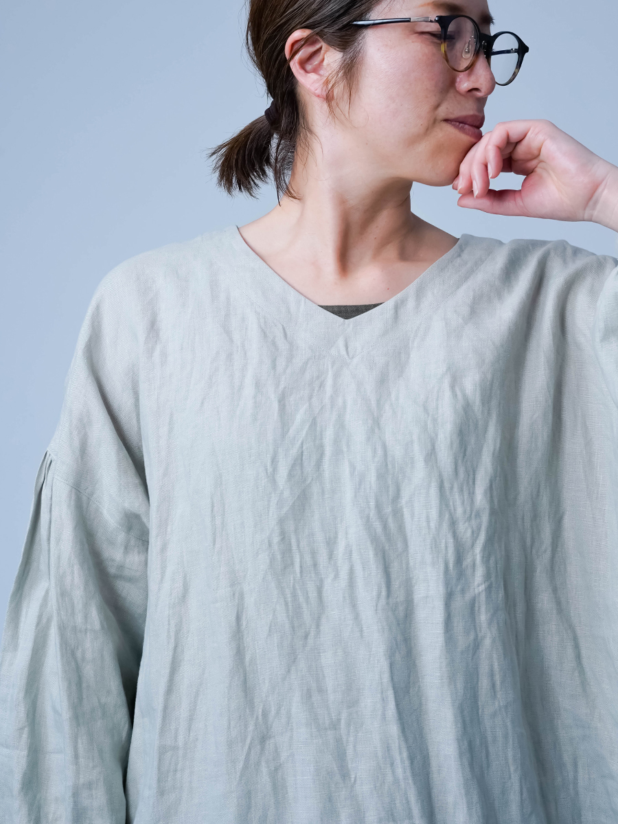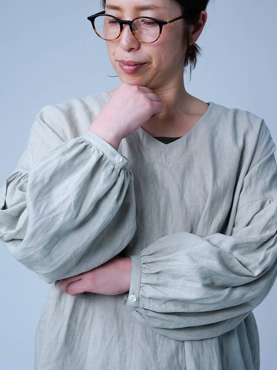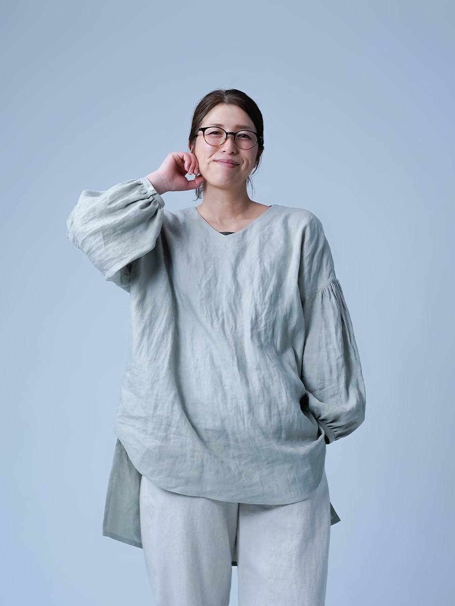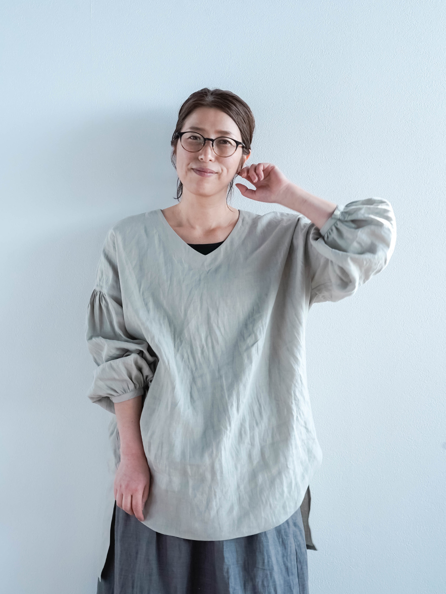 ゆったりなのに、すっきり見え。絶妙なバランスに思わず驚きました。Vネックのおかげで顔まわりはすっきりとした印象に。前後差のある着丈が軽やかさを生み、重たく見えないのも嬉しいポイントです。前は太もも半分ほど、後ろは膝裏あたりまである丈感。ぽわんとしたお袖も愛らしく、つい気分が上がる一着です。