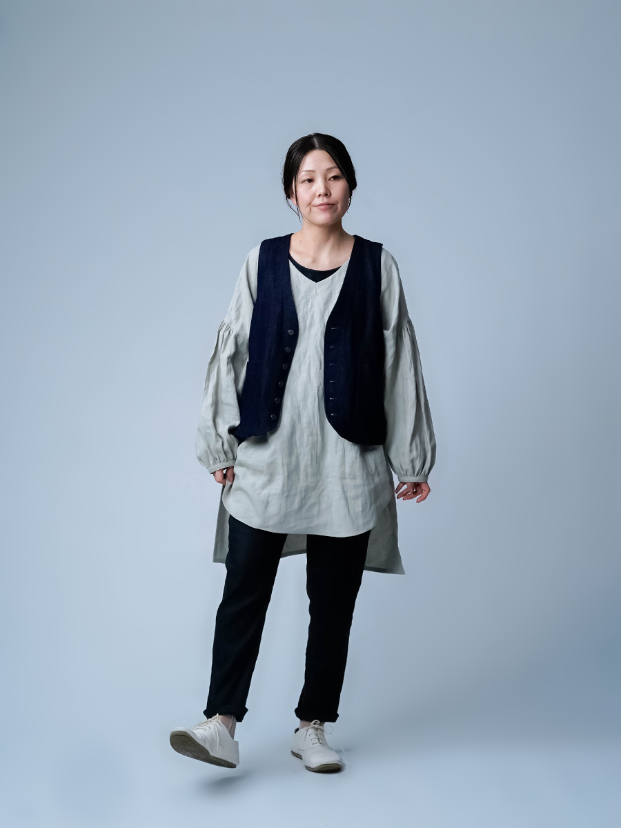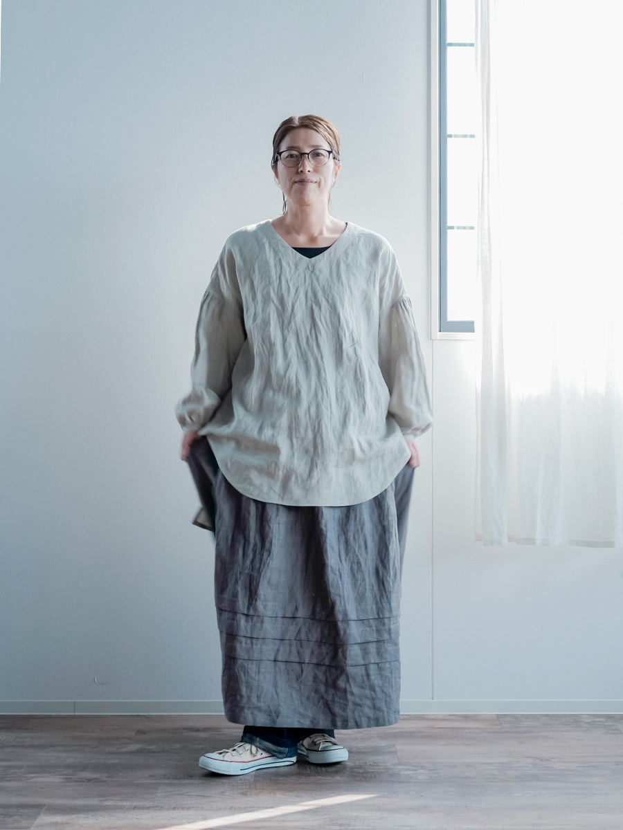 着てみて一番驚いたのは、計算し尽くされた着丈です。気になるお尻まわりをしっかり包み込んでくれる安心感がありながら、裾には動きがあり、歩くたびにヒラヒラと揺れるシルエット。重たさを一切感じさせません。さらにVネックのおかげで、チュニックにありがちな「間延び感」や「着膨れ感」が解消され全体がシャープにまとまります。シャープに見せてくれるのは色だけじゃないのだと、改めて実感できる一着です。着丈は前が太ももの半分くらい、後ろが膝上8cmほど。袖丈は手首あたりでした。