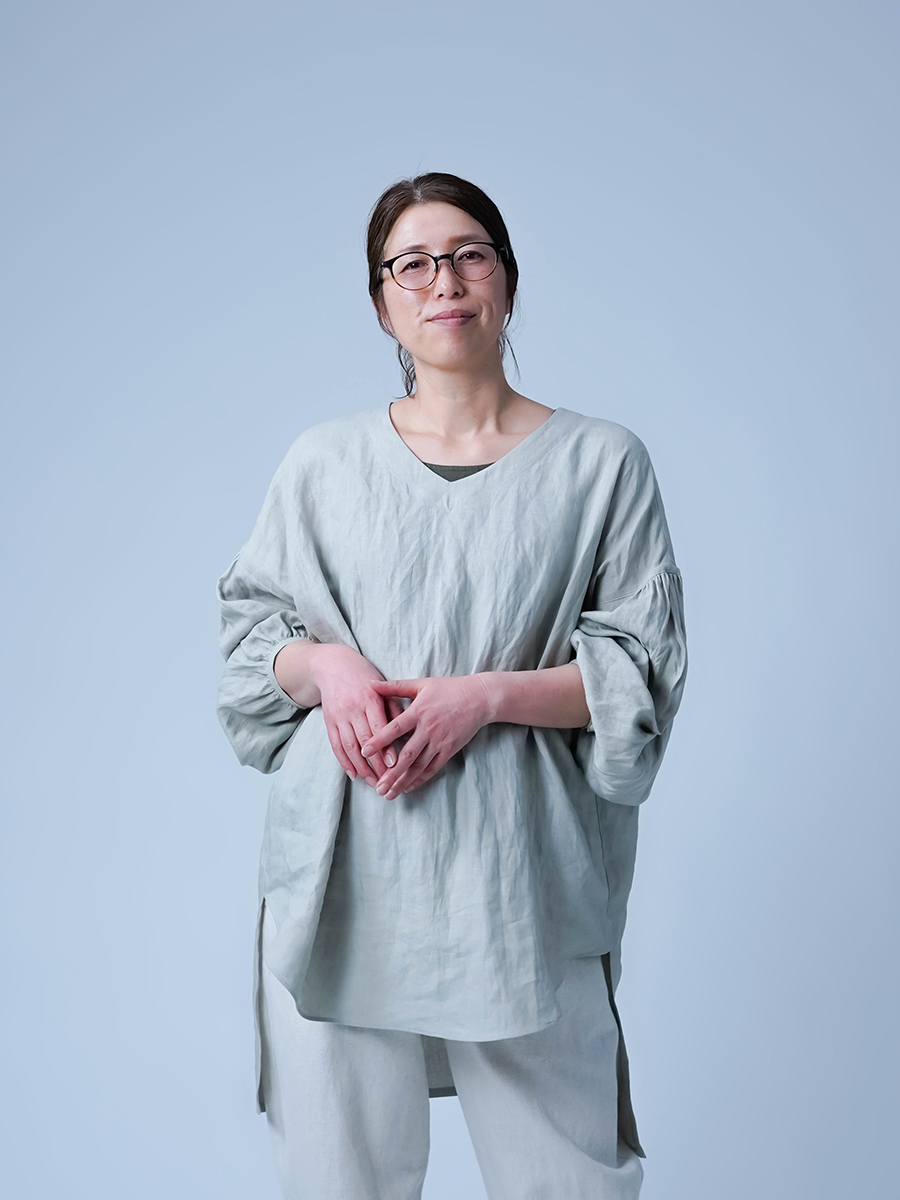 さらりと一枚で着られる、心地よいトップス。ほどよく開いたVネックが、鎖骨やお顔まわりをすっきりときれいに見せてくれます。肩は落ち感のあるデザインで、自然と腕を華奢な印象に。前から見るとラウンドのラインがやわらかさを演出し、後ろはヒップが隠れる丈感で、さりげなく体型をカバーしてくれる頼もしい一枚です。気負わず着られて、それでいてきちんときれいに見せてくれる。毎日の装いにそっと寄り添ってくれる作品です。