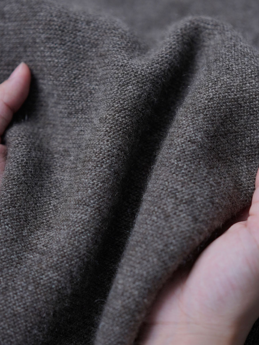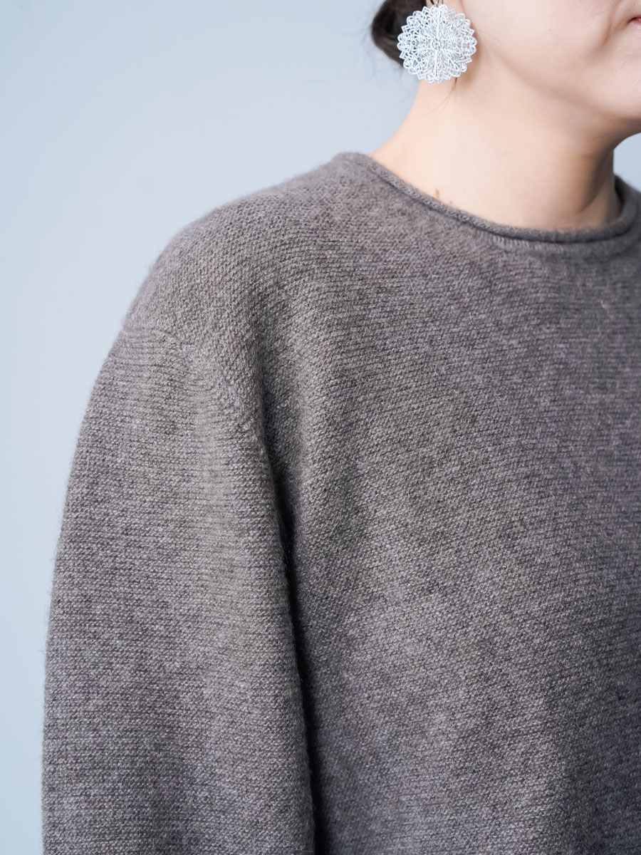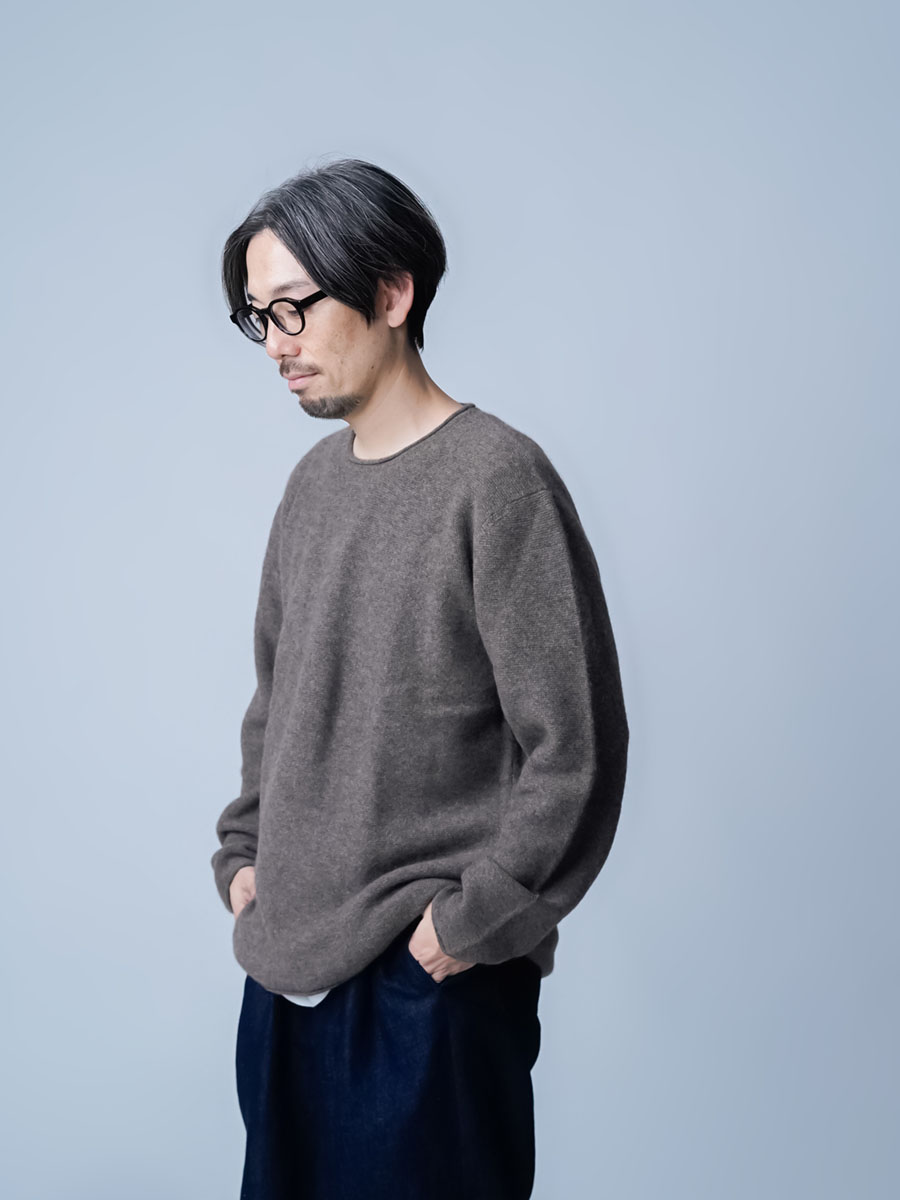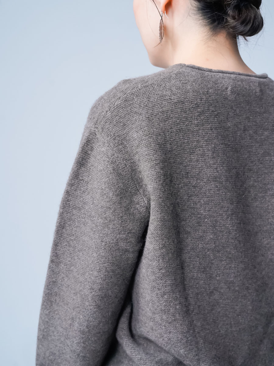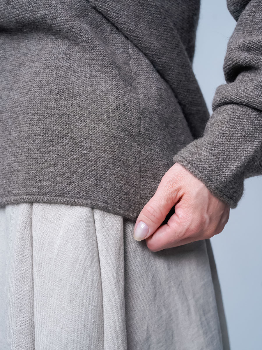 私はLサイズを選びました。体のラインを拾わず中にシャツなど重ね着できるサイズ感です。身体とセーターの間にある空気はしっかりと温かく、それでいて肌は汗ばむことなく、いつもさらりとしています。リネンとヤクの相性がこれほど良いのかと実感できる一着です。空気を纏っているかのように軽く快適さが一日中続く理想のバランス、子育て真っ最中の方や、車の運転が多い方にもぴったりだと思います。厚手のものや冬の重ね着が苦手だけれど、しっかり温かさを求める方にこそぜひおすすめしたいです。着丈はヒップの3分の2ほどをカバーし、袖丈は手の甲が隠れるくらいです。