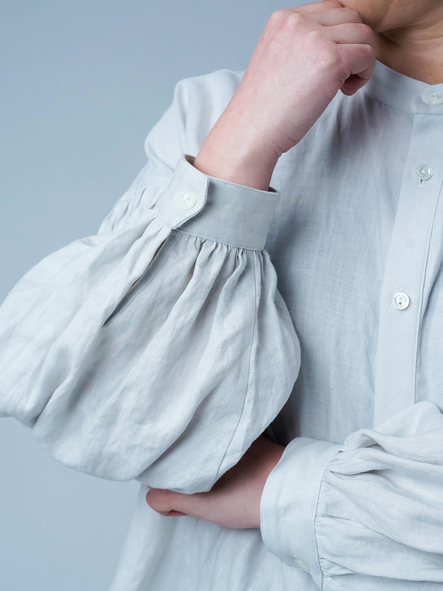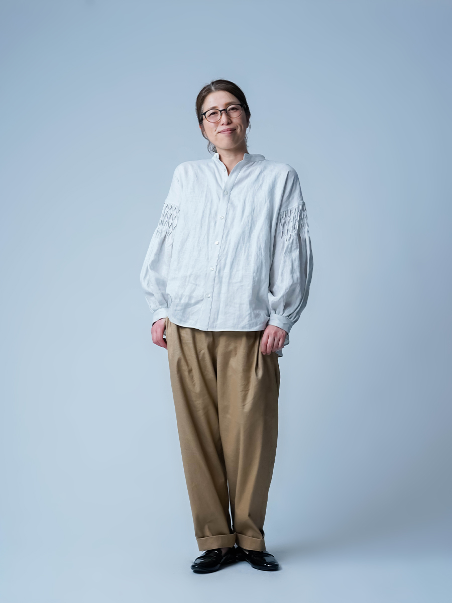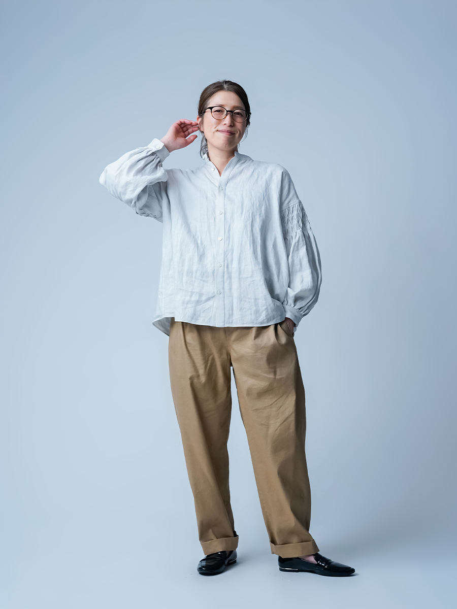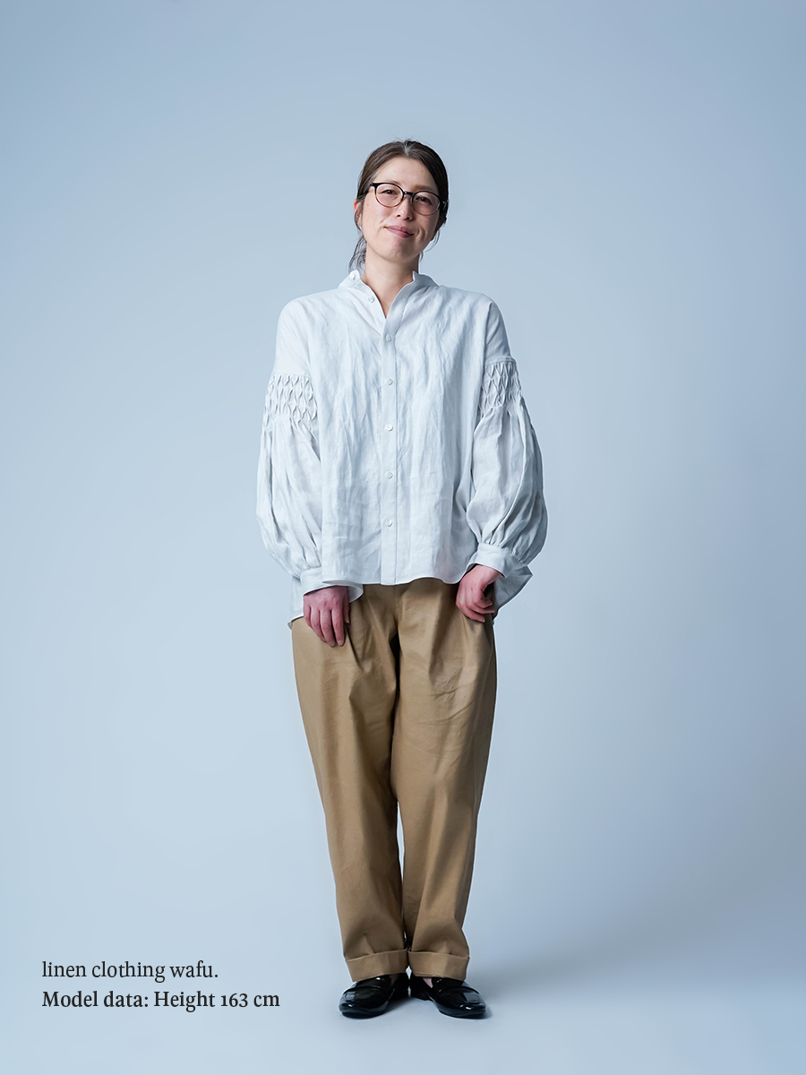 - ※生地工場の生産時期によって色味の濃淡が出ることがございます。セットアップでの着用の場合はご相談下さい。カラーリネンは最初色落ちや生地の性質上、毛羽落ちがある場合がございます。落ち着くまで数回は単品でのお洗濯を。最初は水通しをおすすめします。表面の毛羽立ちがとれて、肌への刺激が極端に少なくなります。リネン特有のネップ、節がございます。