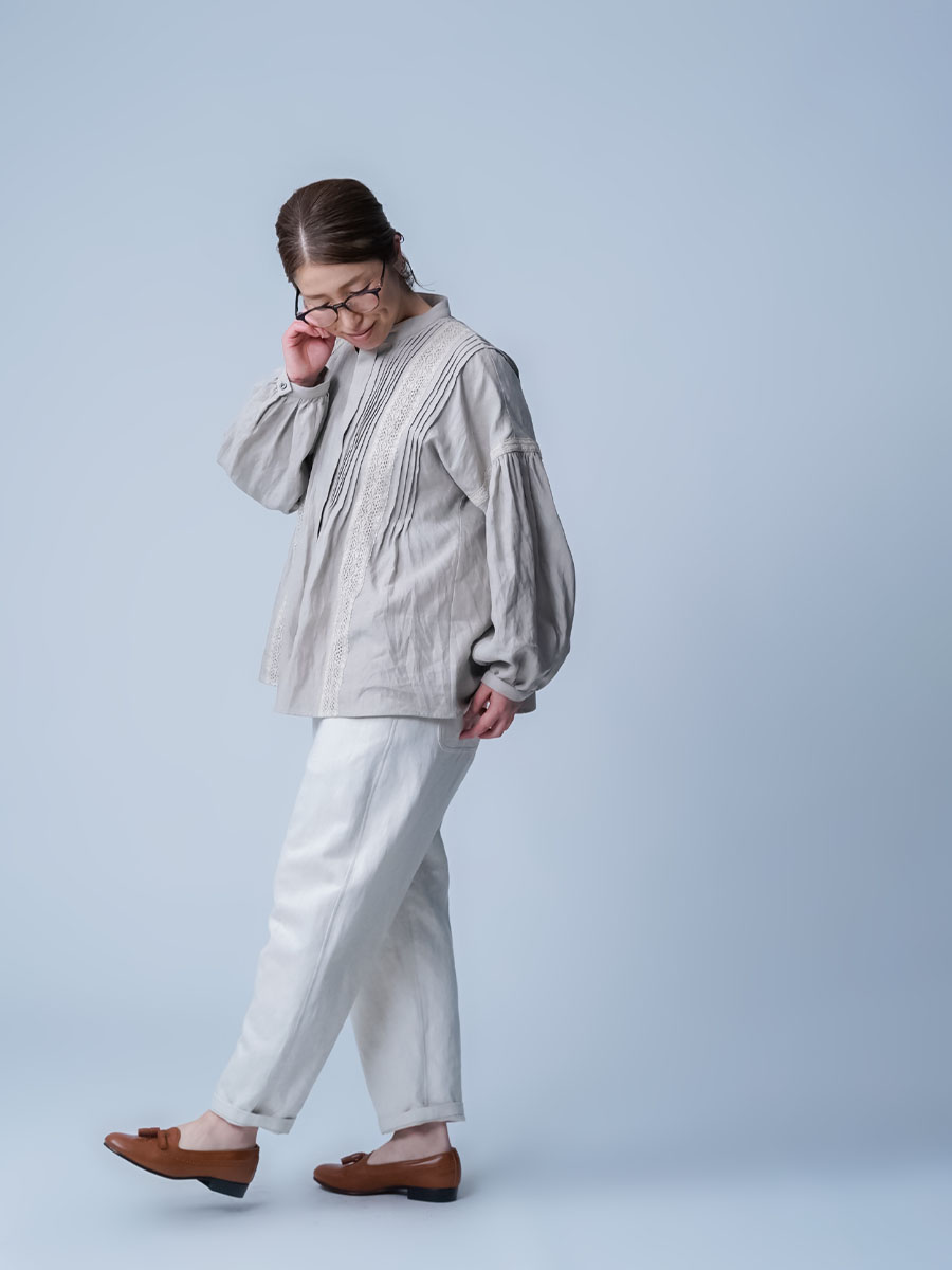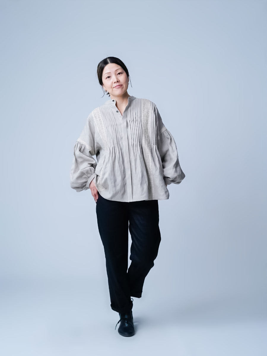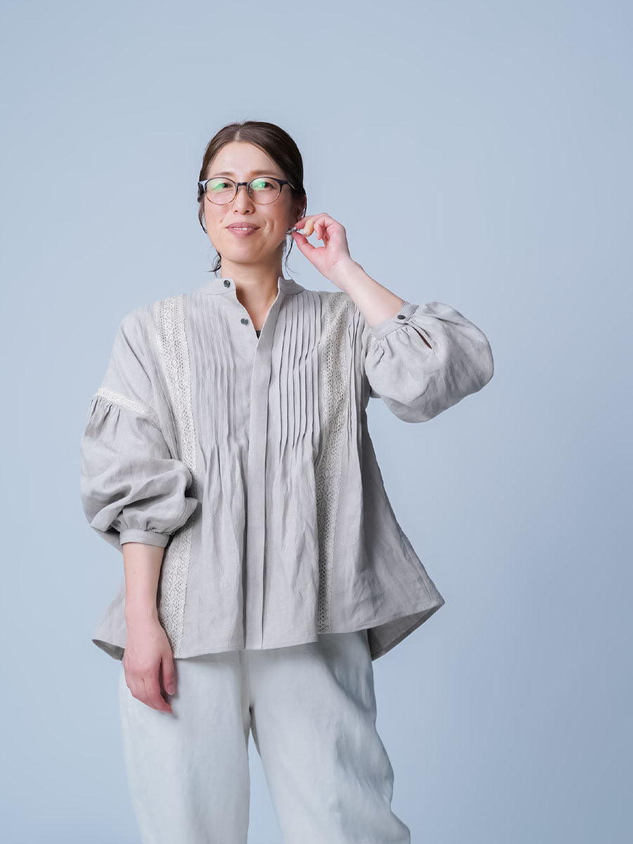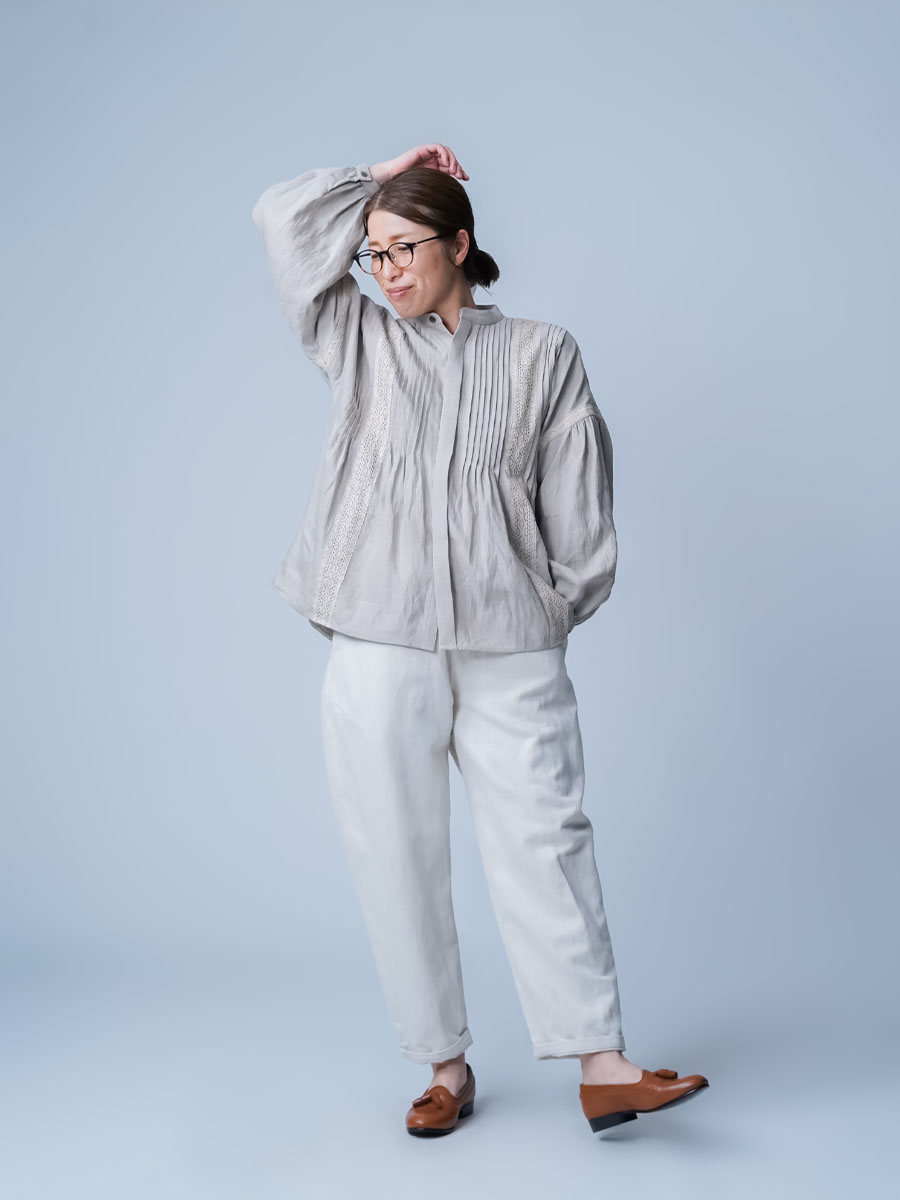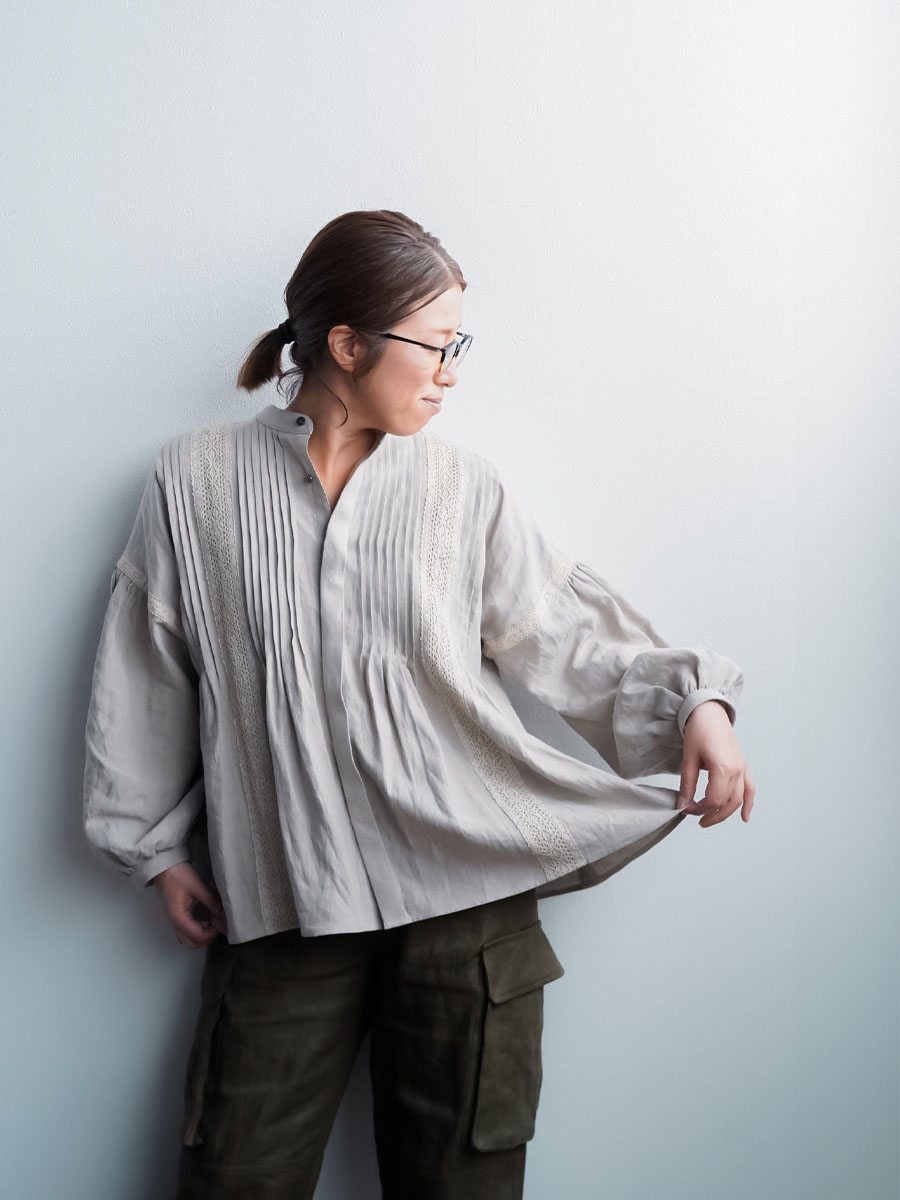着ると意外と甘すぎず、ふんわりとメリハリあるシルエットが出ますよ。タックの終わりから裾が広がりますが、ここが少し絞ったウエスト風になってボトムスにつながるため、着やせして脚長に見えます。お袖は親指の付け根にかかるくらいで、日常使いしやすい袖丈です。後ろ着丈はお尻2/3くらいまで。ちょっと辛口がお好きな方にも、ぜひ挑戦していただきたいブラウスです。