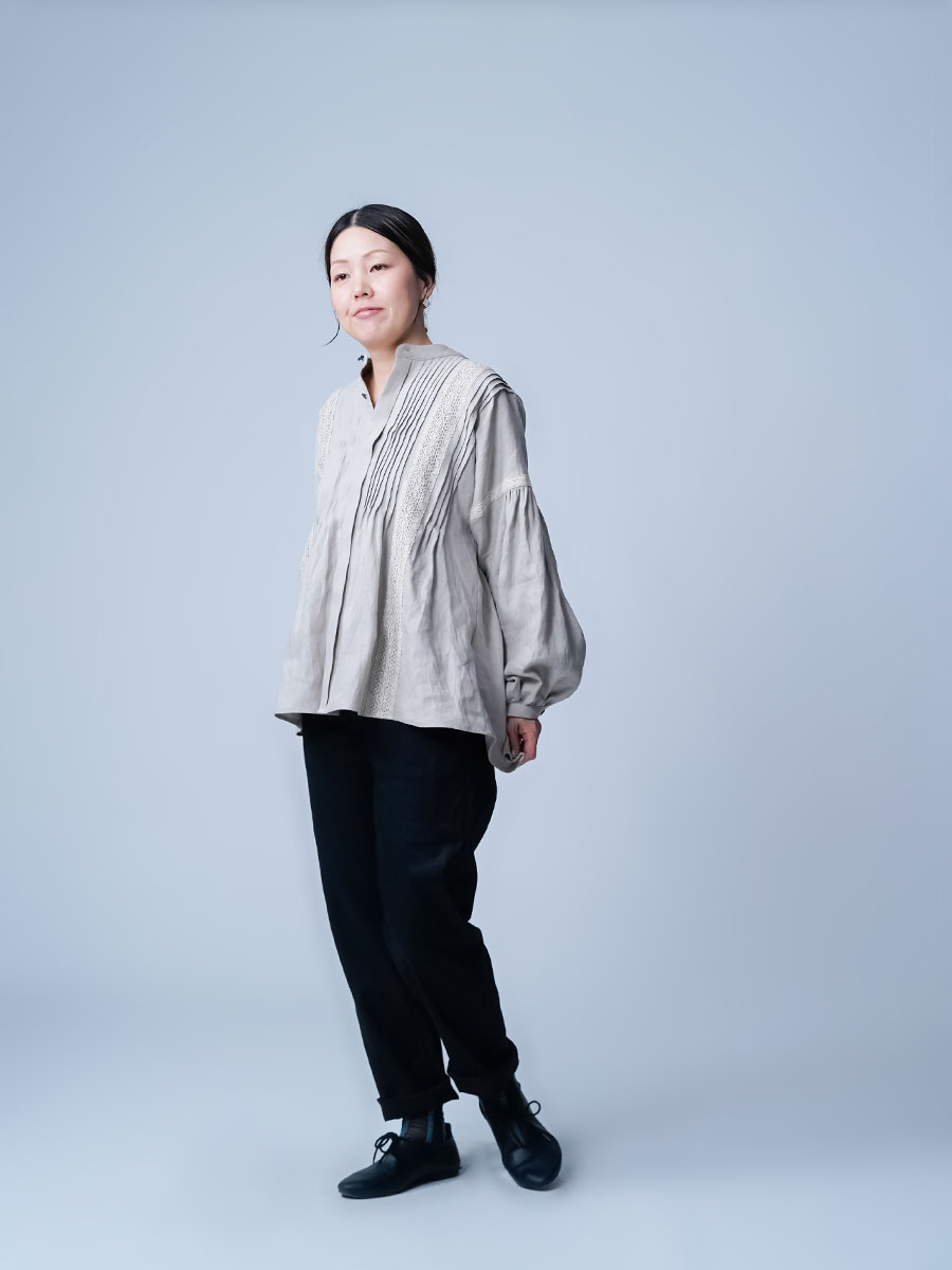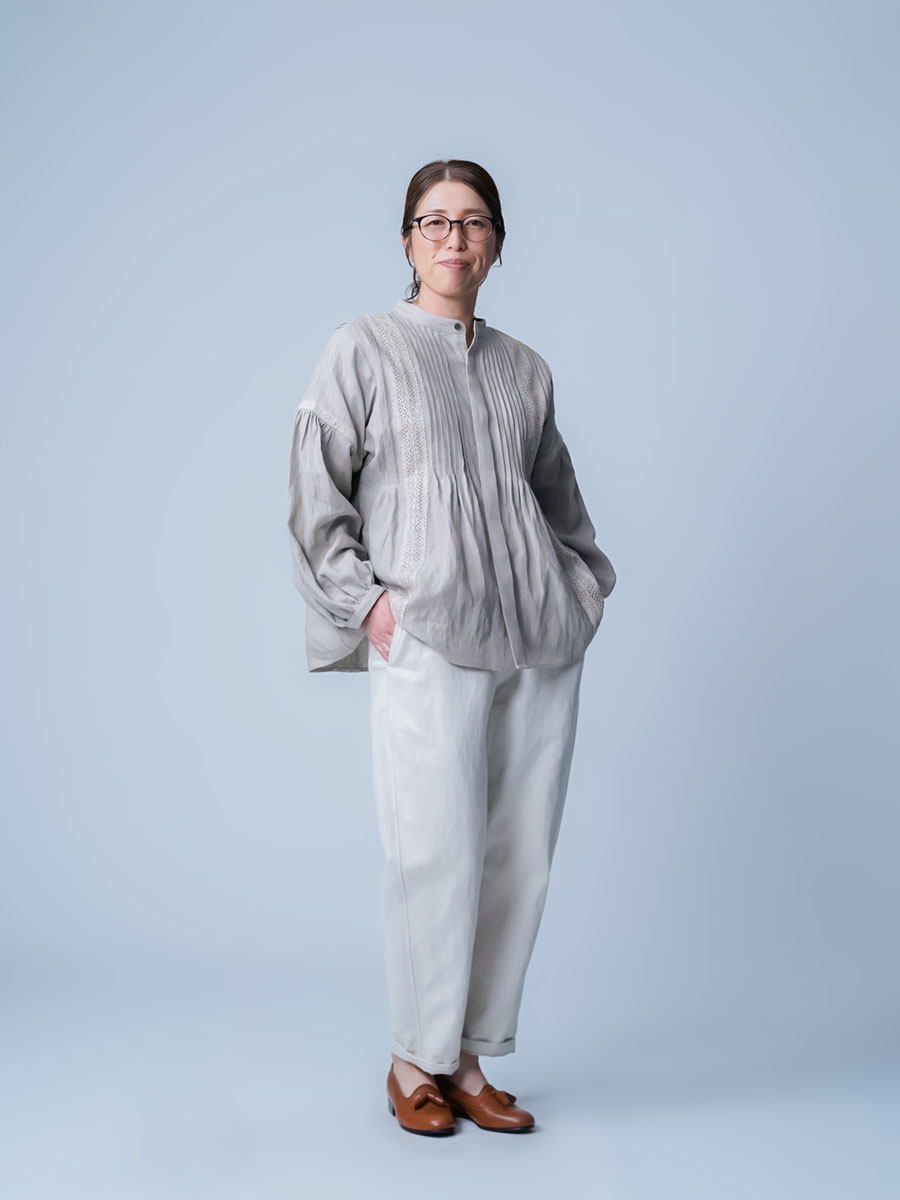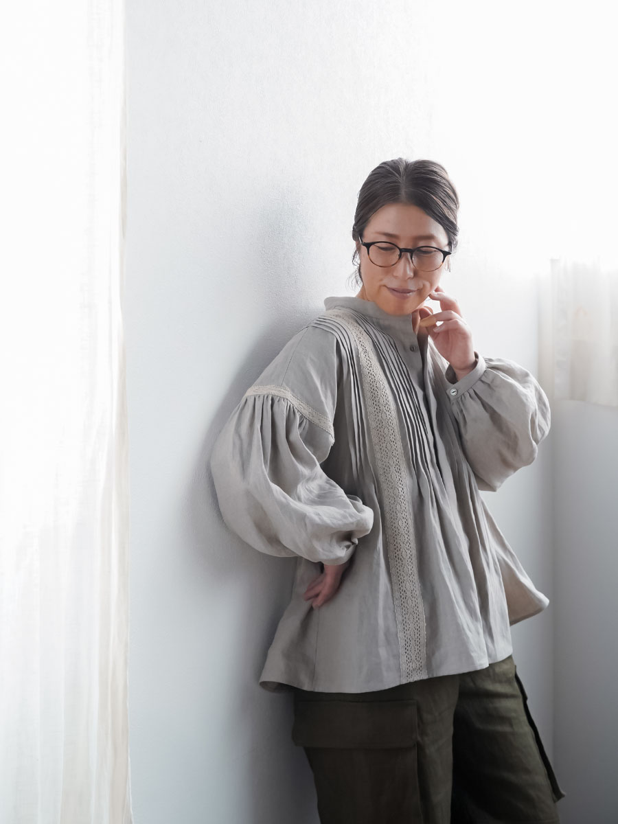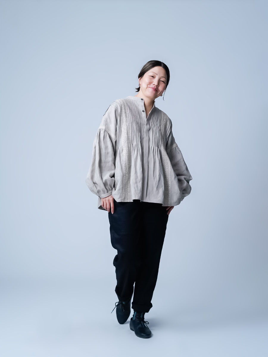 着ると意外と甘すぎず、ふんわりとメリハリあるシルエットが出ますよ。タックの終わりから裾が広がりますが、ここが少し絞ったウエスト風になってボトムスにつながるため、着やせして脚長に見えます。お袖は親指の付け根にかかるくらいで、日常使いしやすい袖丈です。後ろ着丈はお尻2/3くらいまで。ちょっと辛口がお好きな方にも、ぜひ挑戦していただきたいブラウスです。