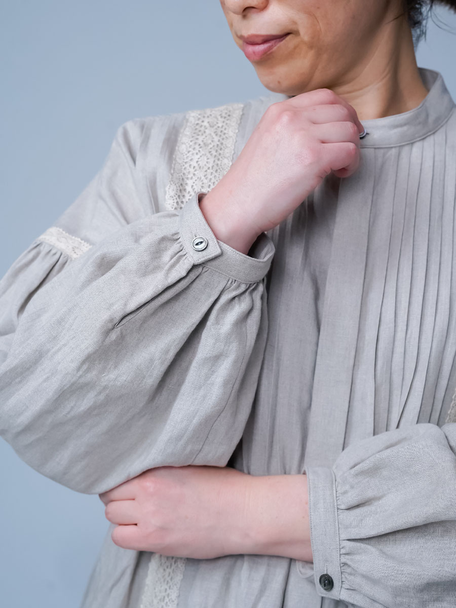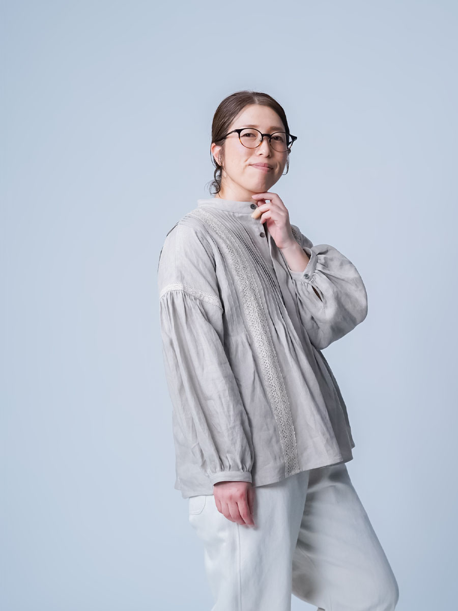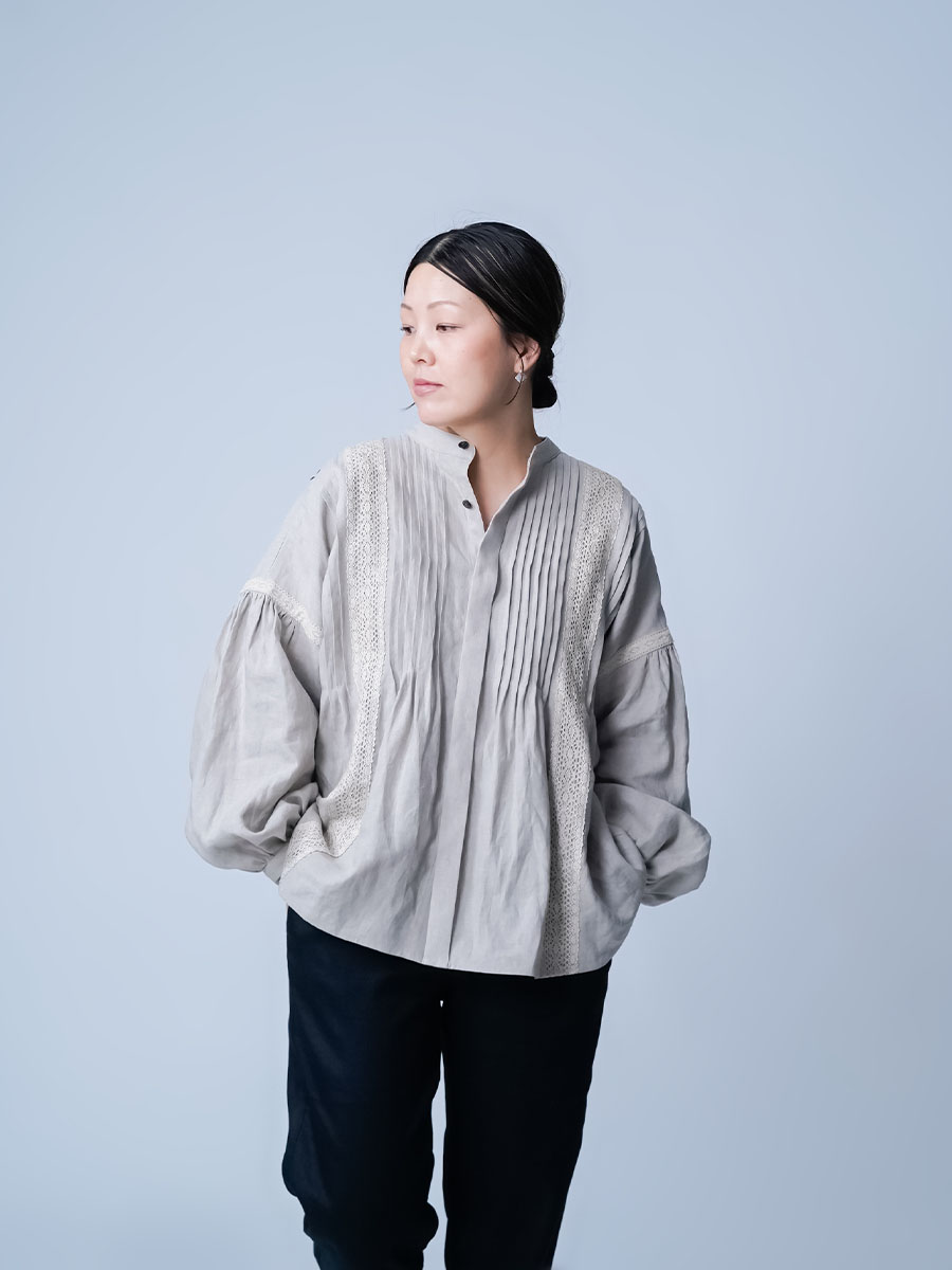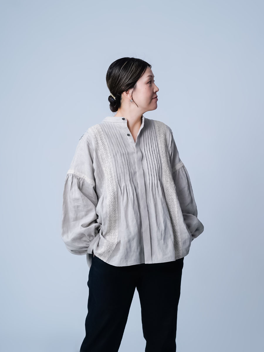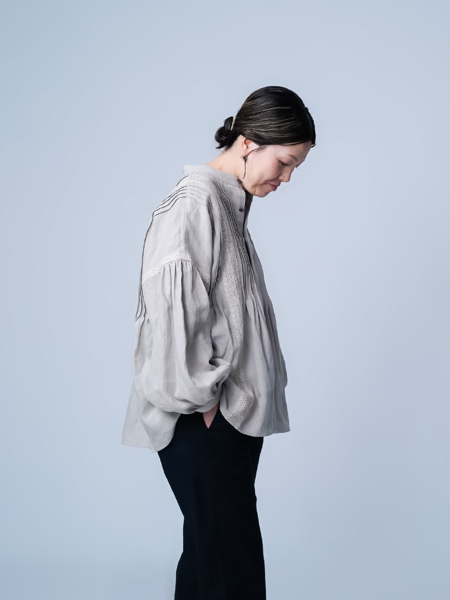 着ると意外と甘すぎず、ふんわりとメリハリあるシルエットが出ますよ。タックの終わりから裾が広がりますが、ここが少し絞ったウエスト風になってボトムスにつながるため、着やせして脚長に見えます。お袖は親指の付け根にかかるくらいで、日常使いしやすい袖丈です。後ろ着丈はお尻2/3くらいまで。ちょっと辛口がお好きな方にも、ぜひ挑戦していただきたいブラウスです。