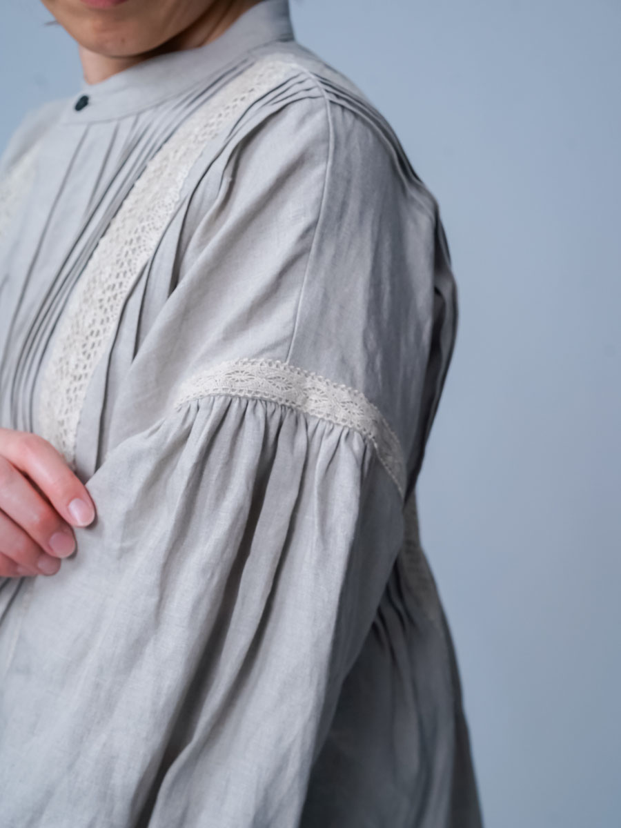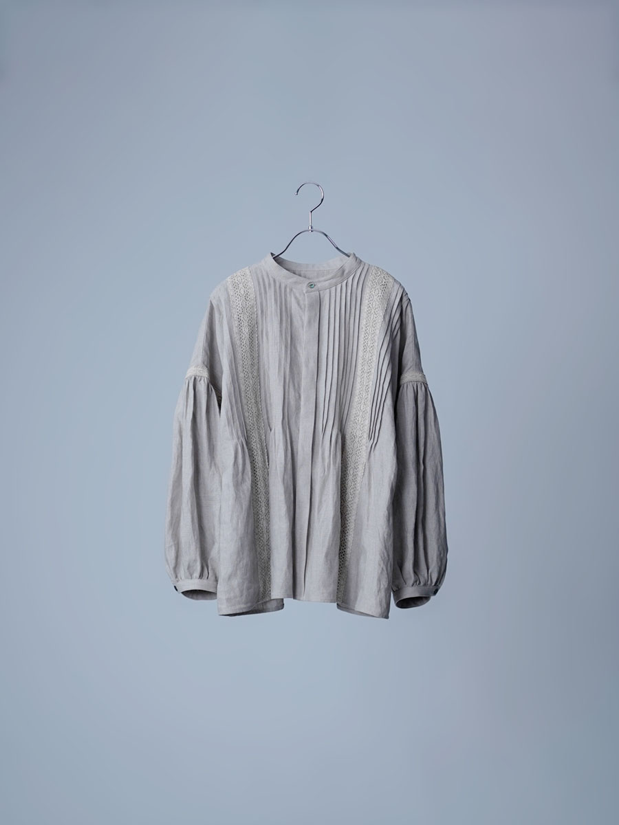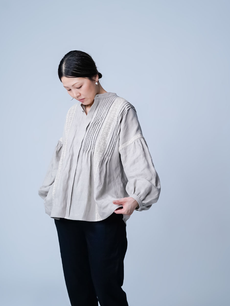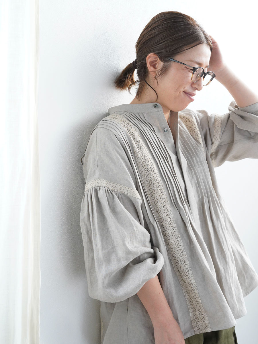 甘いレースもピンタックとの共演で大人でも着れる素敵なデザインに。着丈はおしりの下くらい。袖丈は手の甲半分くらい。程よいAラインがバランスの良い着こなしに仕上げてくれる主役のブラウス。何もいらないです!このブラウスがあれば!