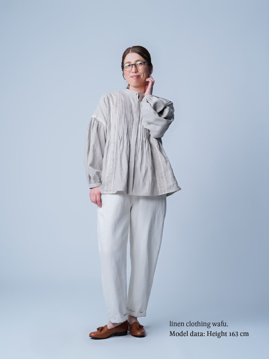 - ※生地工場の生産時期によって色味の濃淡が出ることがございます。セットアップでの着用の場合はご相談下さい。カラーリネンは最初色落ちや生地の性質上、毛羽落ちがある場合がございます。落ち着くまで数回は単品でのお洗濯を。最初は水通しをおすすめします。表面の毛羽立ちがとれて、肌への刺激が極端に少なくなります。リネン特有のネップ、節がございます。