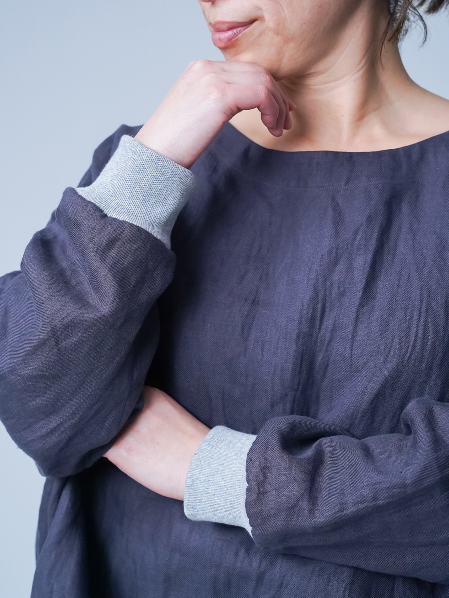 ゆったり見頃でリラックスフィットです。お袖はちょうど手首が隠れるくらい、後ろ着丈はお尻の半分くらいです。首回りは鎖骨の中央が見えるくらいです。脇下にもたっぷりとゆとりがあるので、中への重ね着もしやすいです。リブのおかげで袖がまくれて落ちてこないので、家事やお手洗いの際にもストレスフリーです。