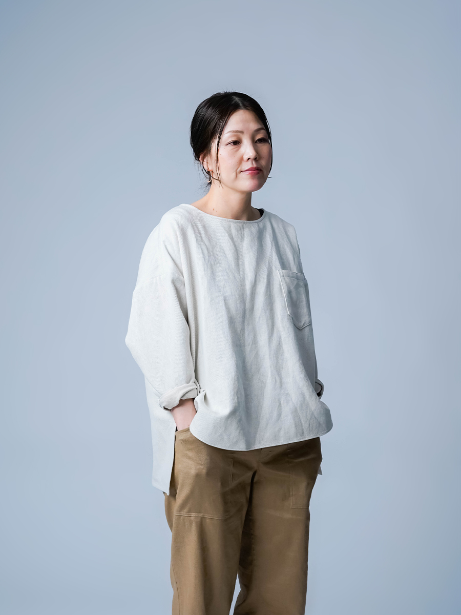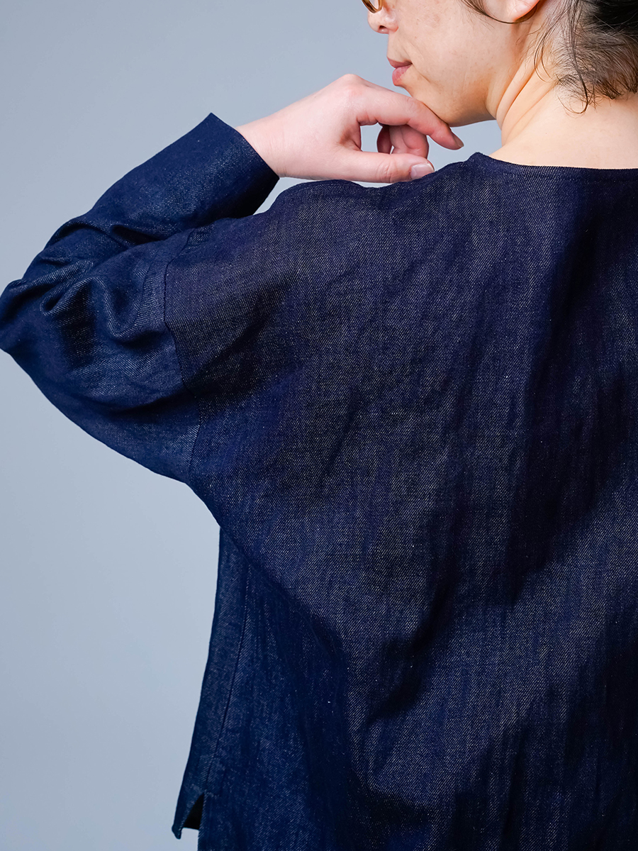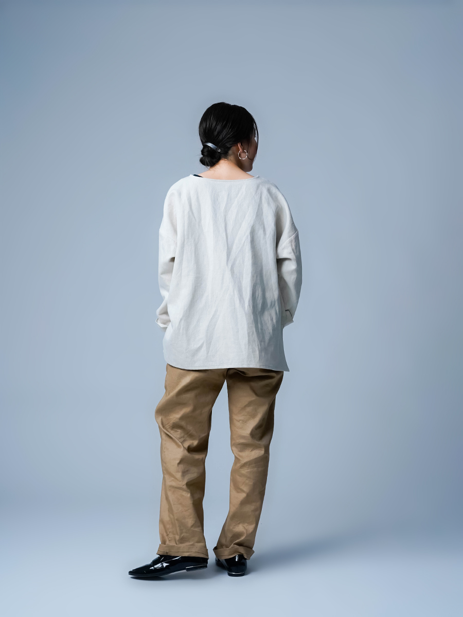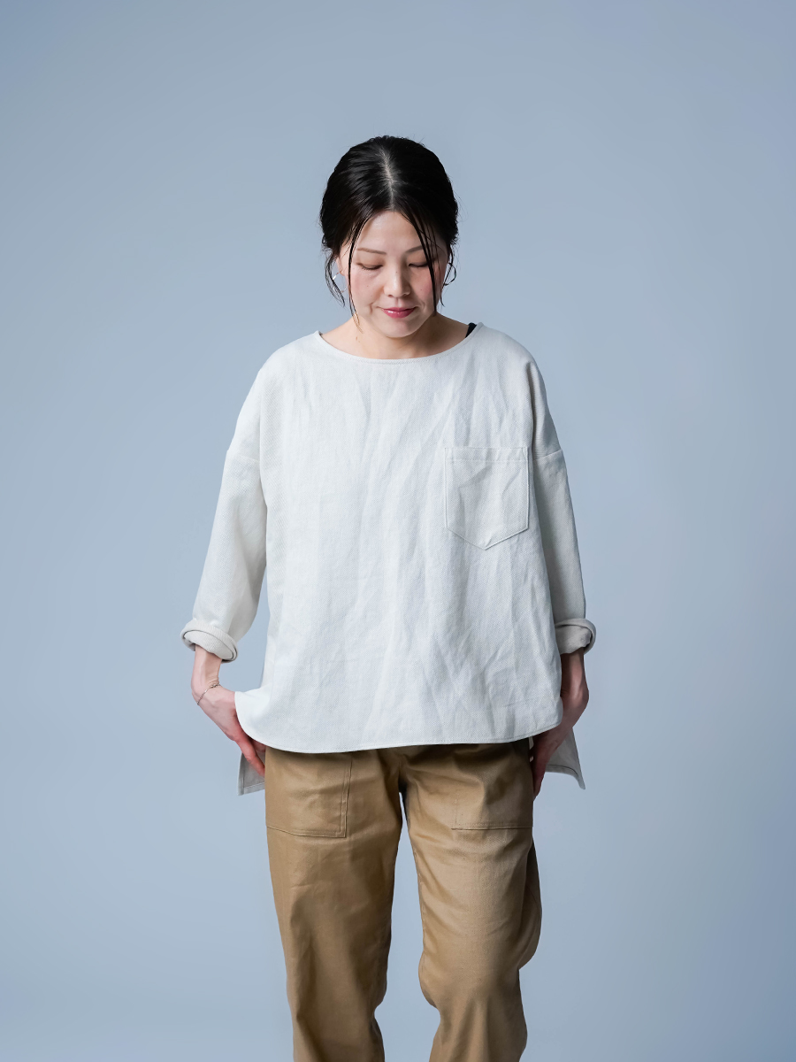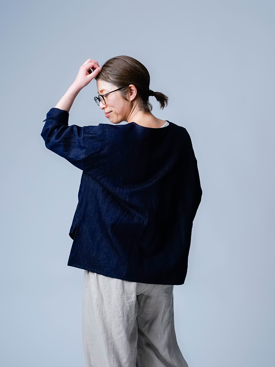 とても着やすく、日常に取り入れやすい一枚。肩の切り替えがやや下になっているのでで、肩まわりをすっきりと見せてくれます。首元は鎖骨が見えるほどよい開き具合で、軽やかな印象。袖は手首ほどの長さで、折り返して着るのもおすすめです。身幅はインナーを一枚重ねても窮屈さがなく、後ろ丈はおしりがほぼ隠れる安心の丈感です。