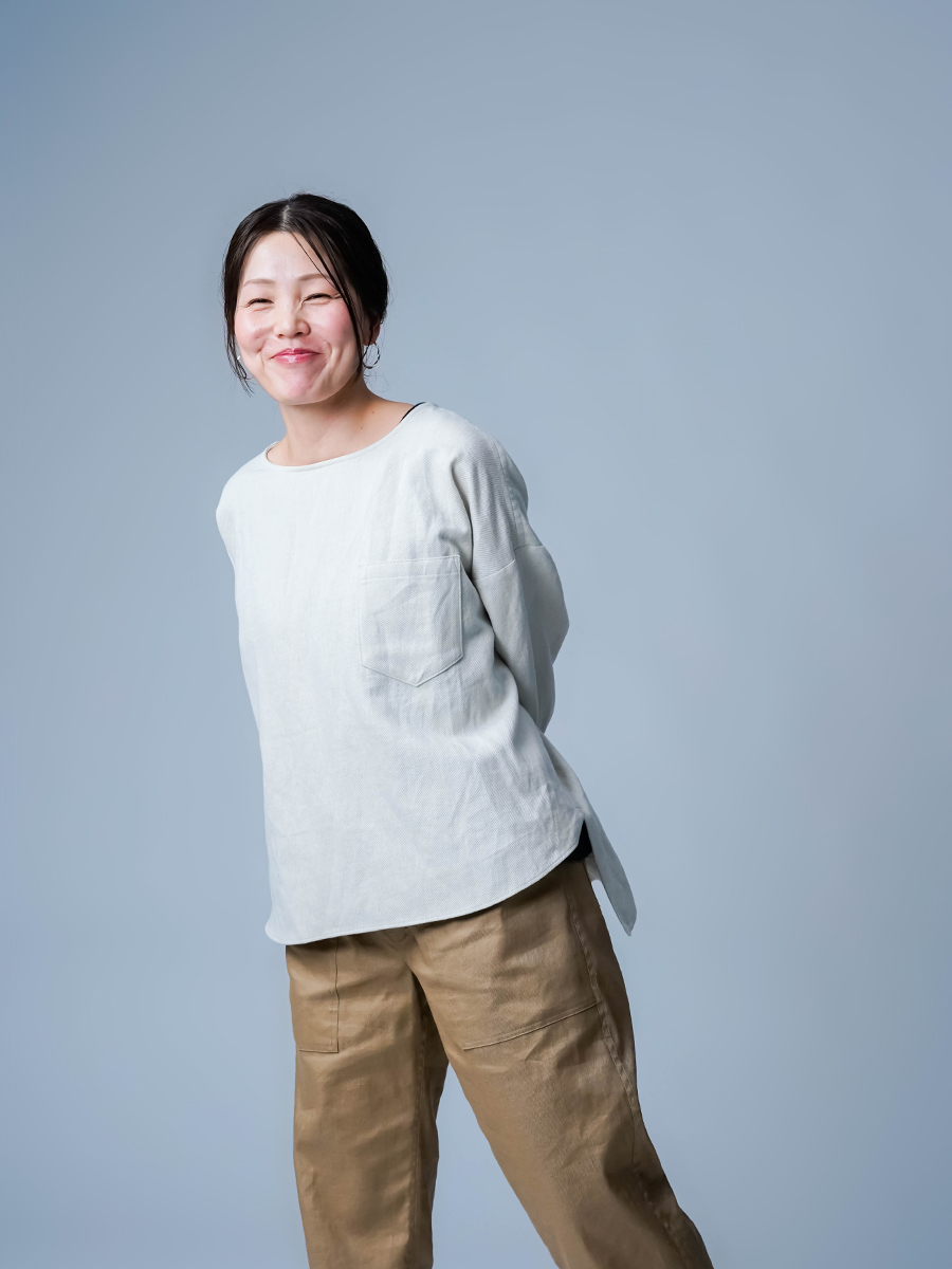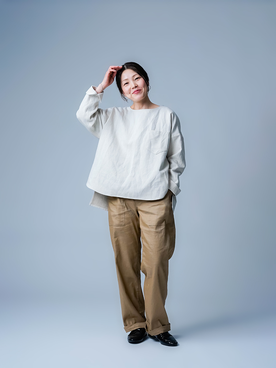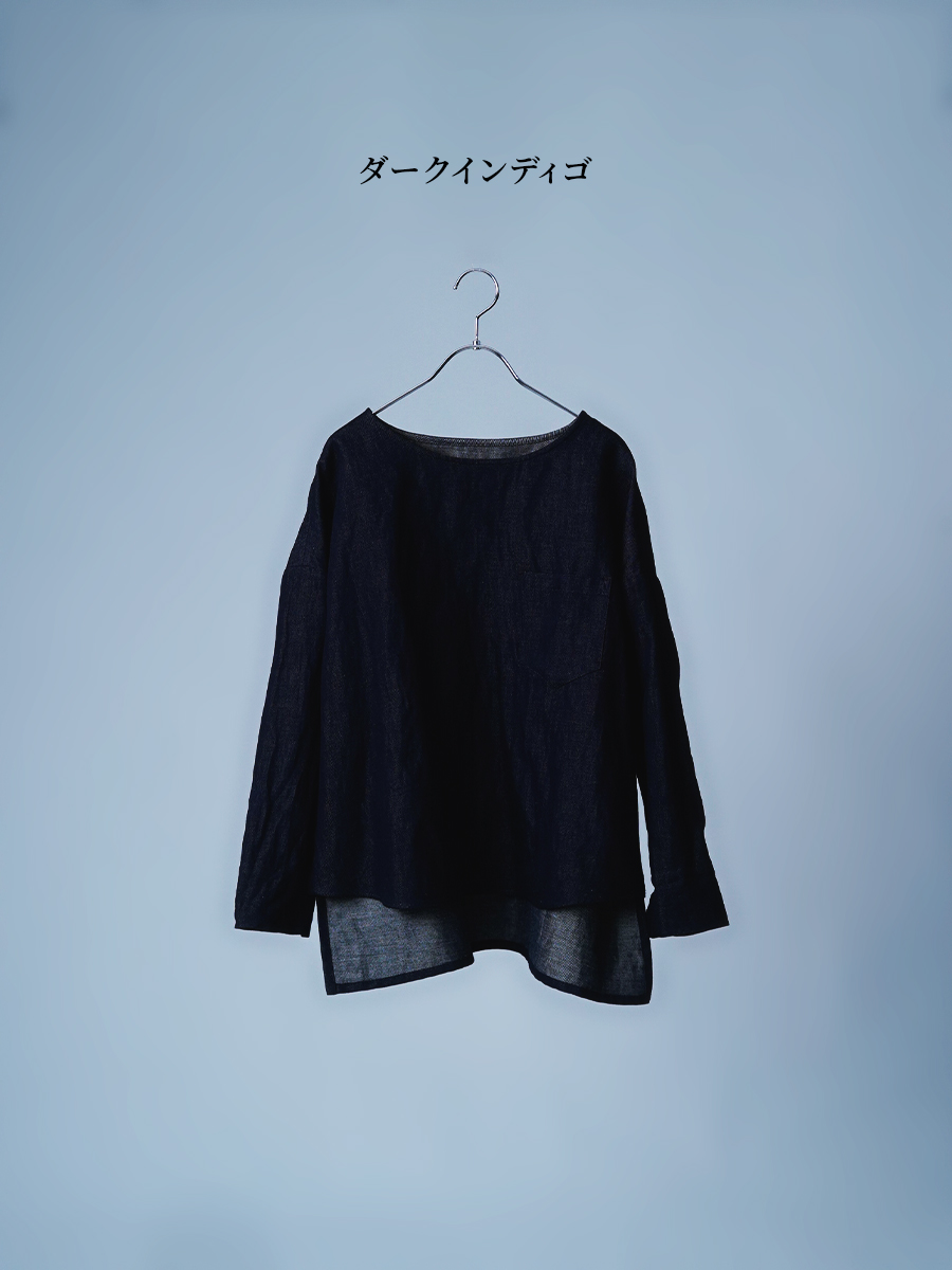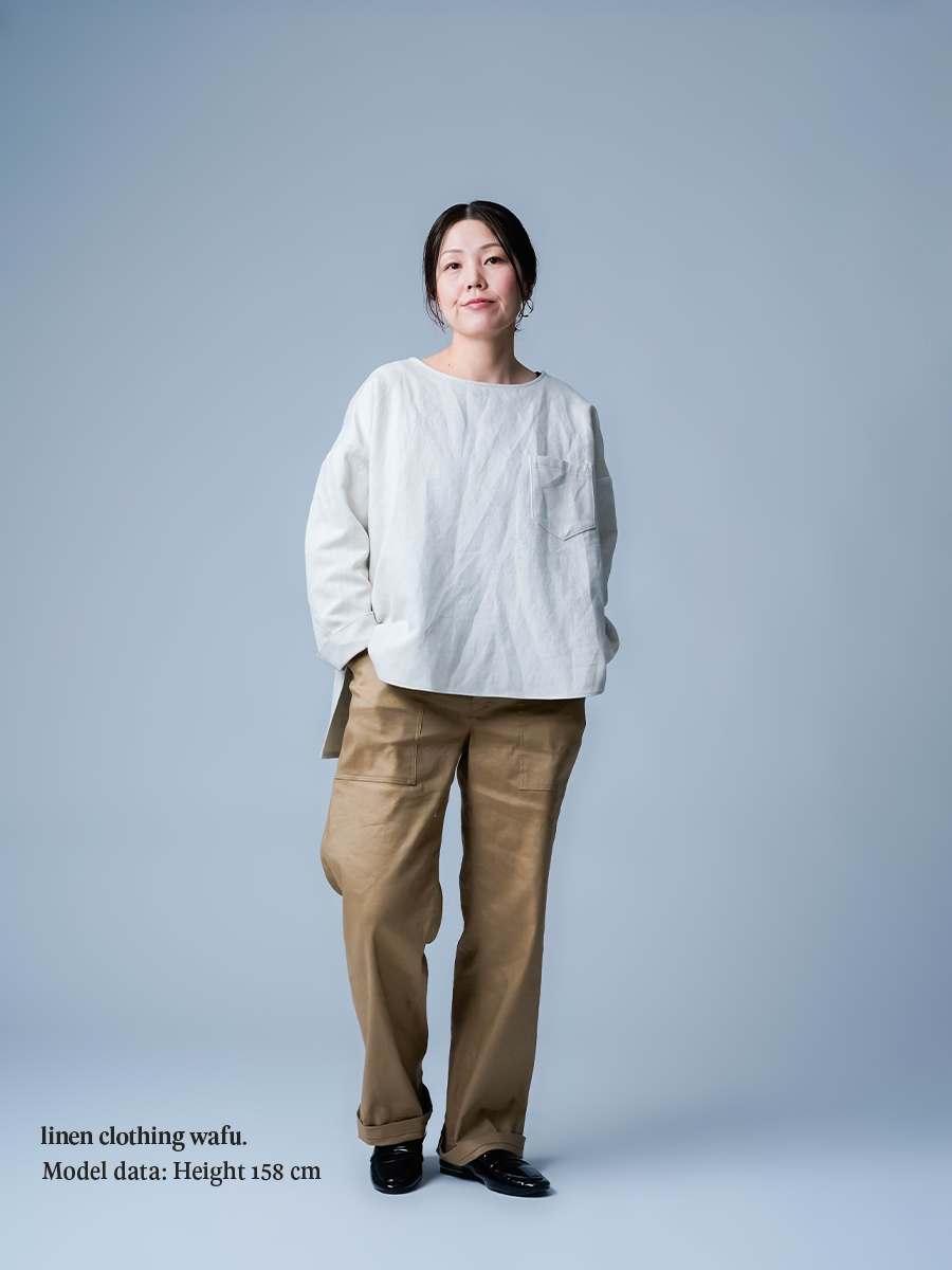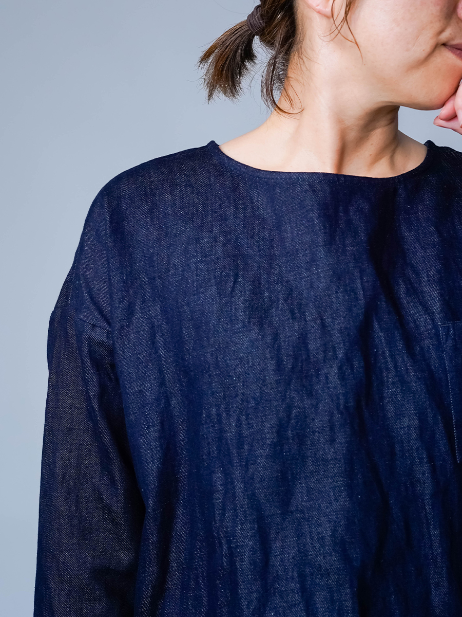 とても着やすく、日常に取り入れやすい一枚。肩の切り替えがやや下になっているのでで、肩まわりをすっきりと見せてくれます。首元は鎖骨が見えるほどよい開き具合で、軽やかな印象。袖は手首ほどの長さで、折り返して着るのもおすすめです。身幅はインナーを一枚重ねても窮屈さがなく、後ろ丈はおしりがほぼ隠れる安心の丈感です。