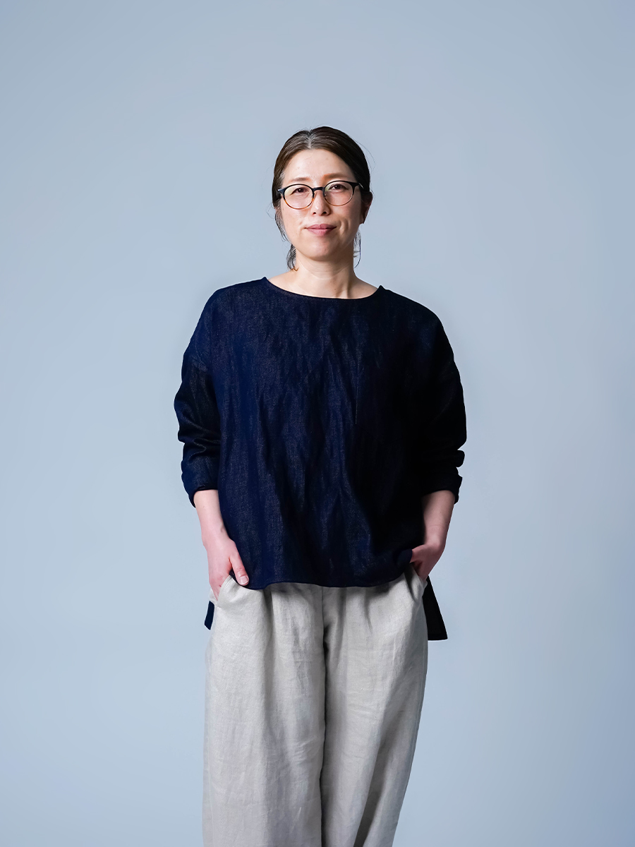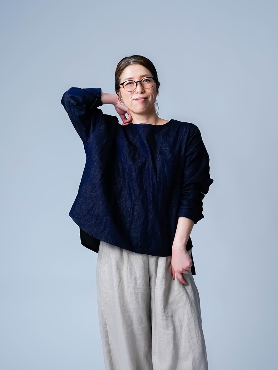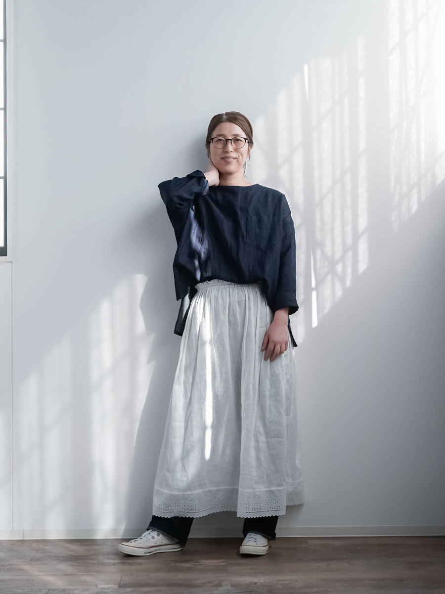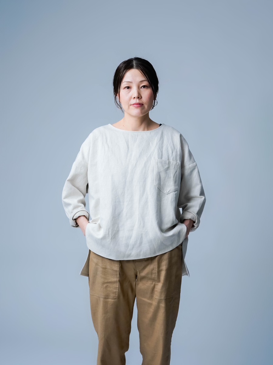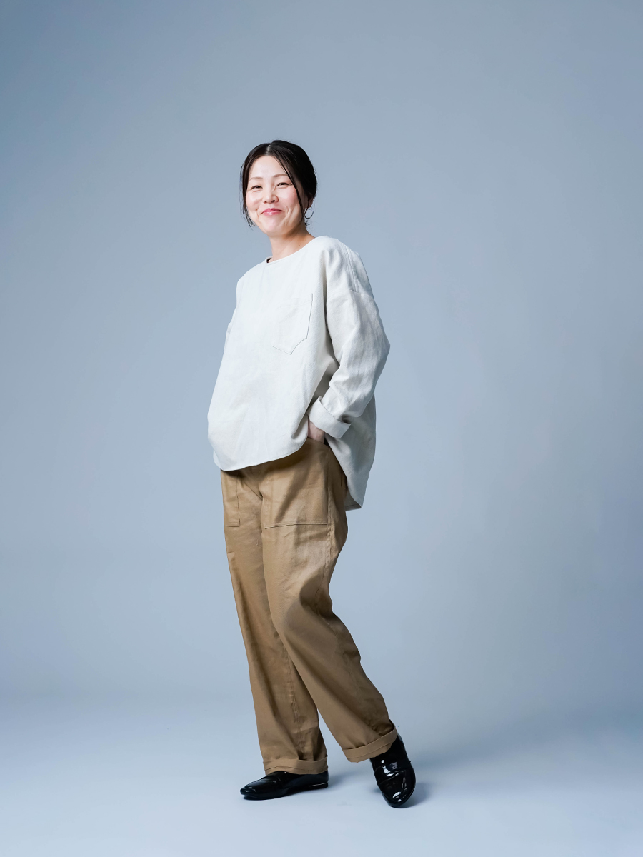 とても着やすく、日常に取り入れやすい一枚。肩の切り替えがやや下になっているのでで、肩まわりをすっきりと見せてくれます。首元は鎖骨が見えるほどよい開き具合で、軽やかな印象。袖は手首ほどの長さで、折り返して着るのもおすすめです。身幅はインナーを一枚重ねても窮屈さがなく、後ろ丈はおしりがほぼ隠れる安心の丈感です。