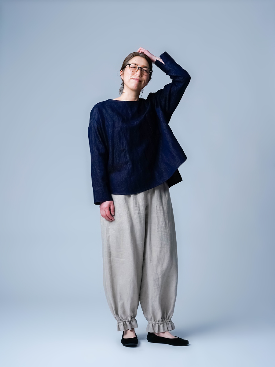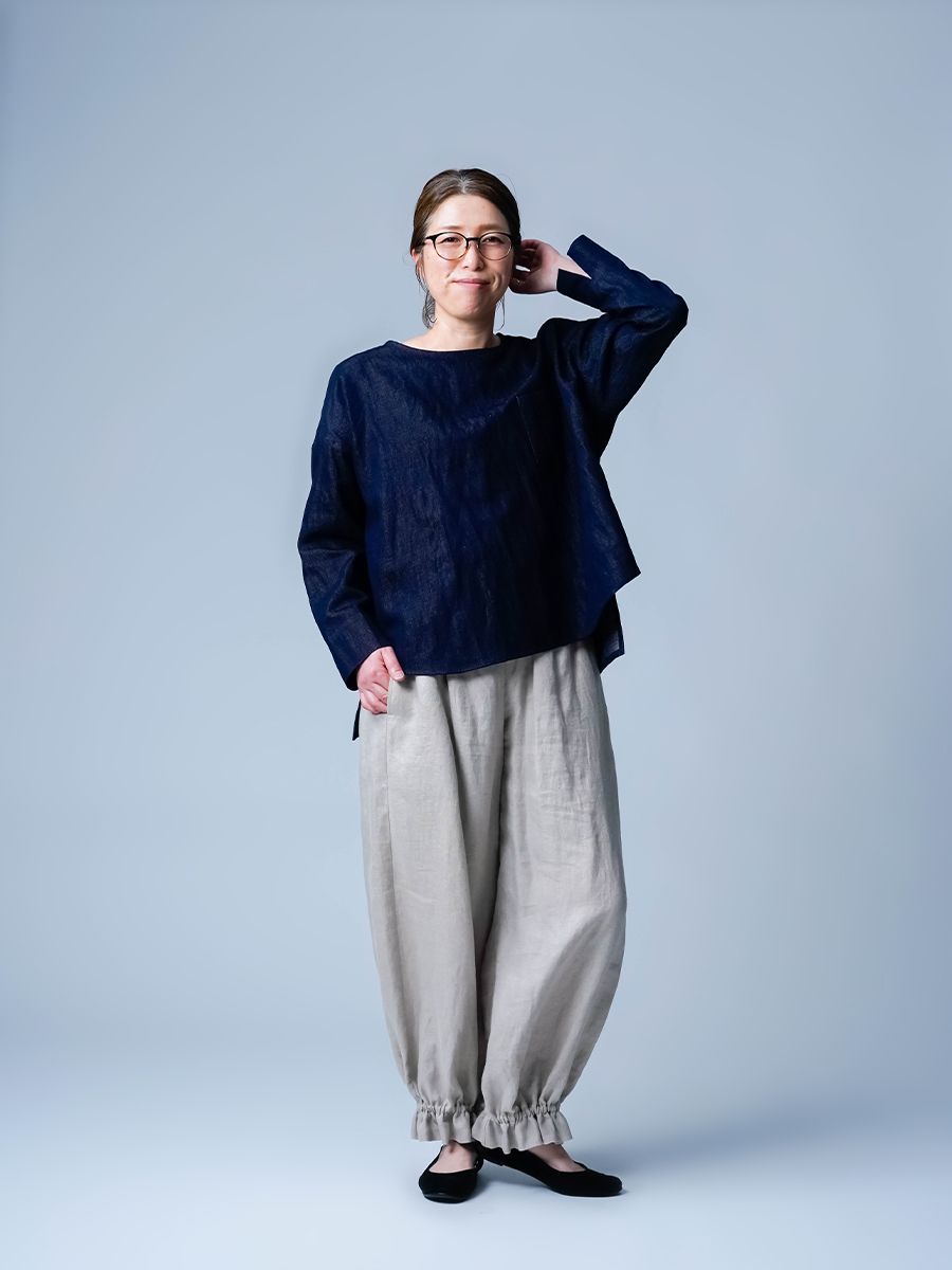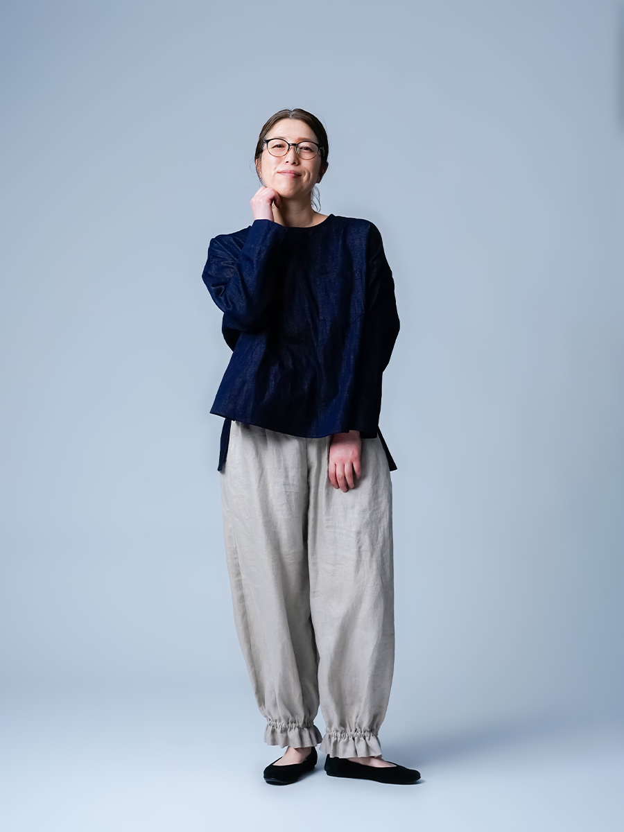 軽くてゆったり。リネンコットンデニムなので、ごわつきがなく軽やかに着られるトップスです。襟まわりは鎖骨が見えるくらいで、顔まわりをすっきり見せてくれます。身幅にゆとりはありますが、大きすぎる感じはありませんでした。丈は前後差があり、前をインしなくてもいい丈感。後ろはお尻が軽く隠れるくらいでパンツにも合わせやすそうです。袖丈は手の甲に半分ほどかかるくらいで、スリットが入っているので動きやすいです。