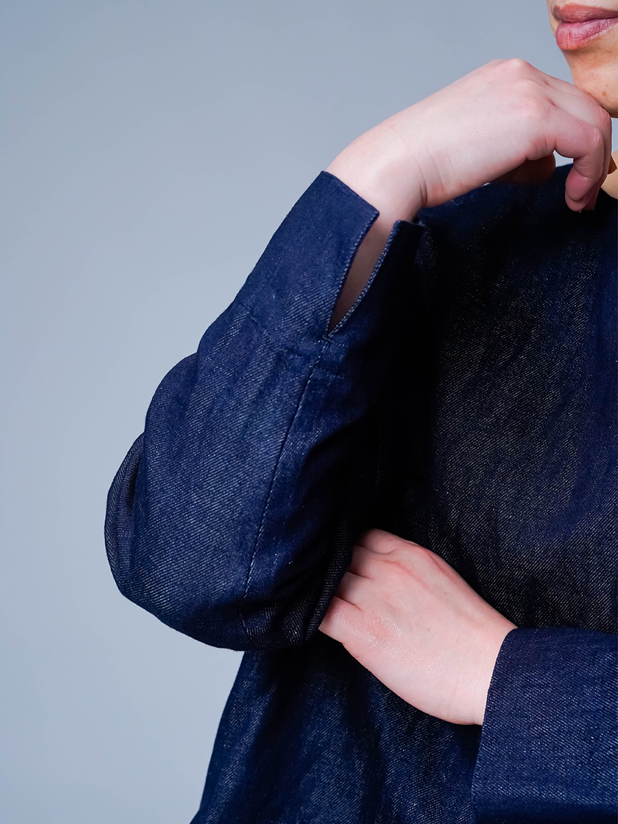 デニムのトップスは、ありそうで意外と見かけないので、まずそこで驚きました。着てみると軽くてさらっとしていて、さらに驚き。シルエットもきれいで、しかも万能に使えるとなると、こちらの気持ちが少し追いつきません。前裾はやわらかなラウンド、後裾はすっきりとしたスクエア。スリットが入ることで、前からは端正に、横からはふわりとAラインに見えます。お腹まわりに自然な余白ができるので、体のラインを拾いすぎず、すっきり見えるのも嬉しいところです。前着丈は骨盤よりやや下、後ろはお尻が3/4隠れるくらい。袖は折り返すと手首が見えて、抜け感も楽しめます。