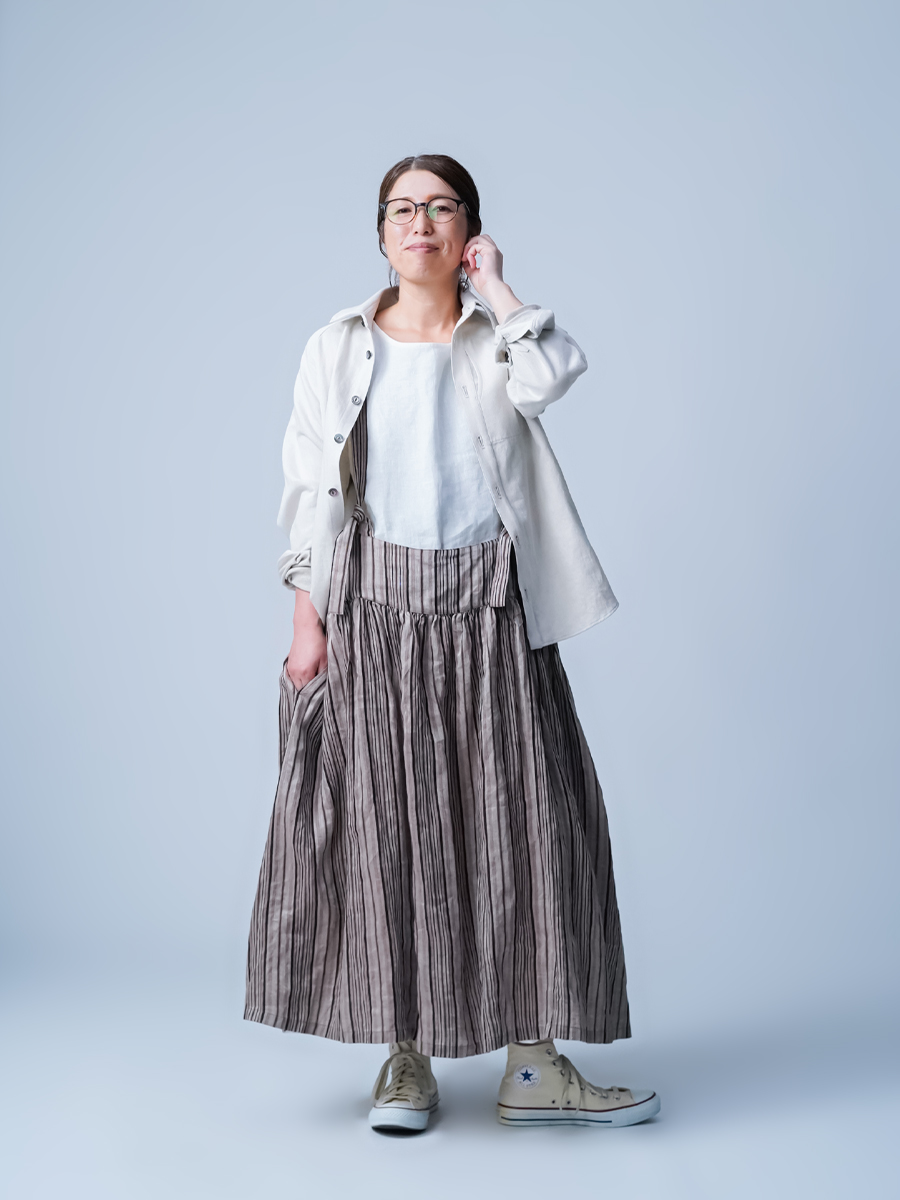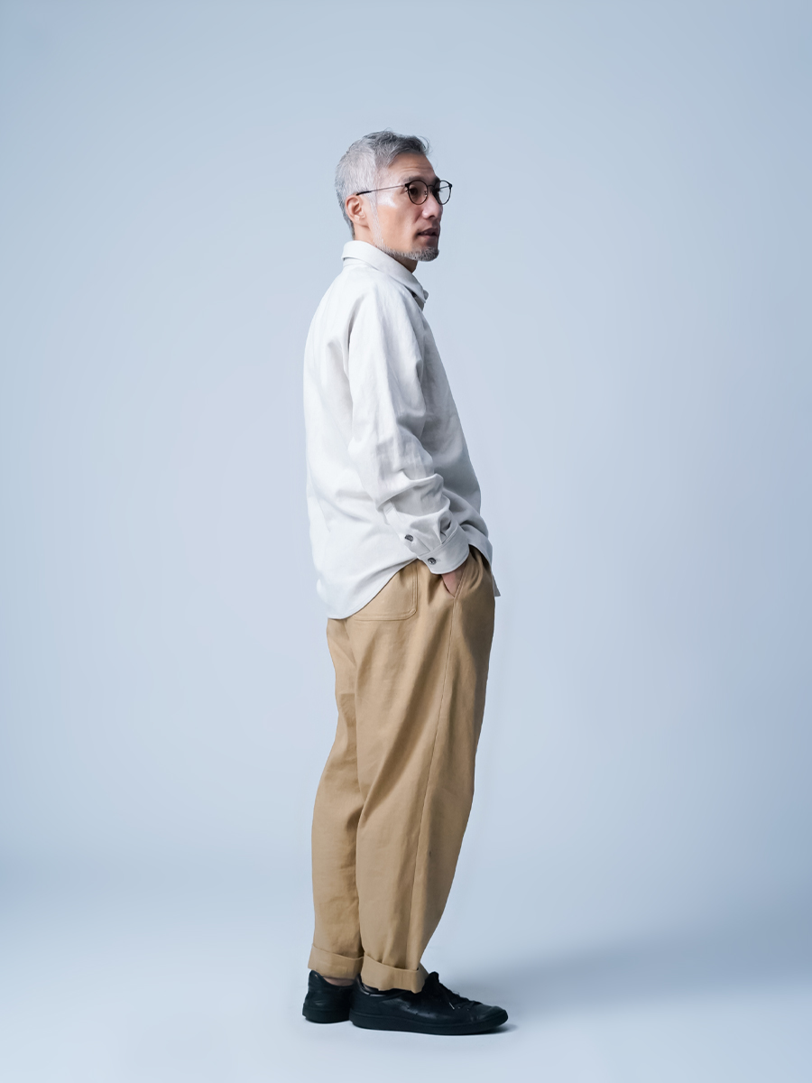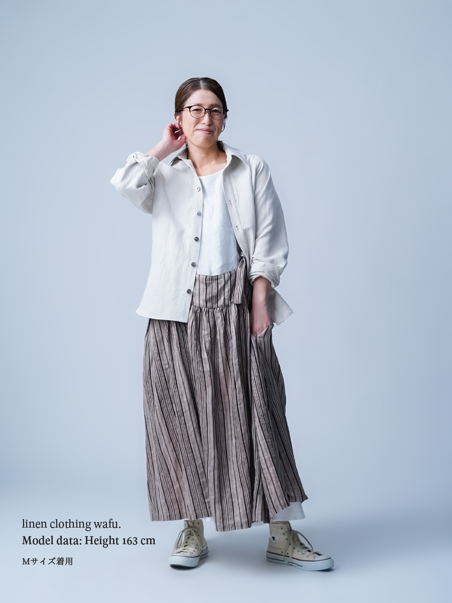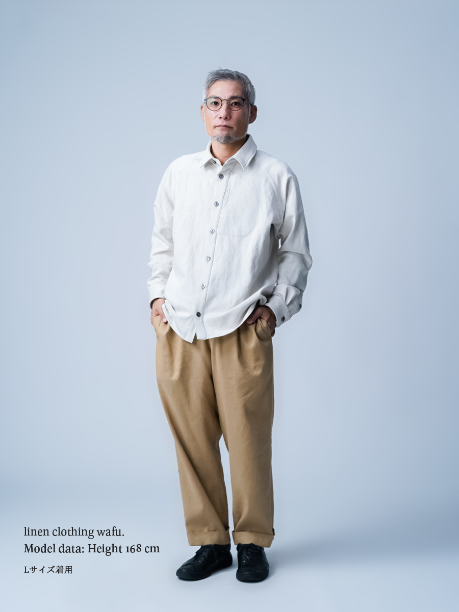 - ※生地工場の生産時期によって色味の濃淡が出ることがございます。セットアップでの着用の場合はご相談下さい。カラーリネンは最初色落ちや生地の性質上、毛羽落ちがある場合がございます。落ち着くまで数回は単品でのお洗濯を。最初は水通しをおすすめします。表面の毛羽立ちがとれて、肌への刺激が極端に少なくなります。リネン特有のネップ、節がございます。