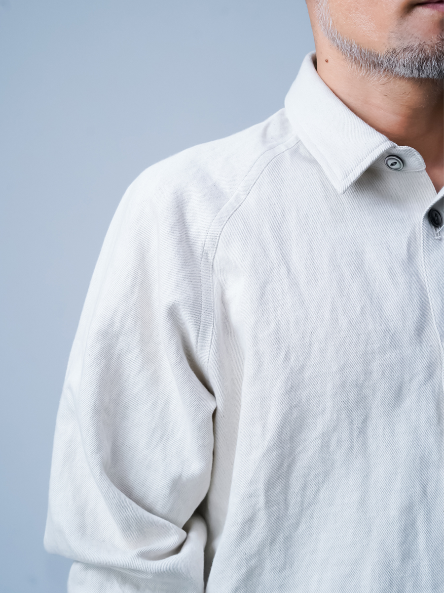 Mサイズでもゆったり目です。着丈はお尻が隠れるくらい。袖丈は指先まで隠れます。シャツと言うよりジャケット感覚ですね。立体的にかっちりとした襟にしっかりとしたホワイトデニム生地で軽アウターな雰囲気でさっと羽織れます。しっかりとした生地に大きめのボタンがアクセントです。