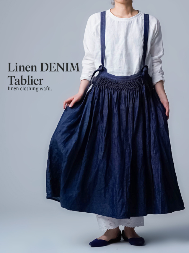 【リネンデニムタブリエ】腰まわりに、静かな意匠を リネンデニム スモッキングタブリエ / インディゴ