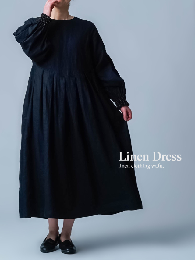 【リネンドレス】後世へ手渡す、時間の結晶 ハニカムスモッキング 鍵盤タックドレス / 黒色